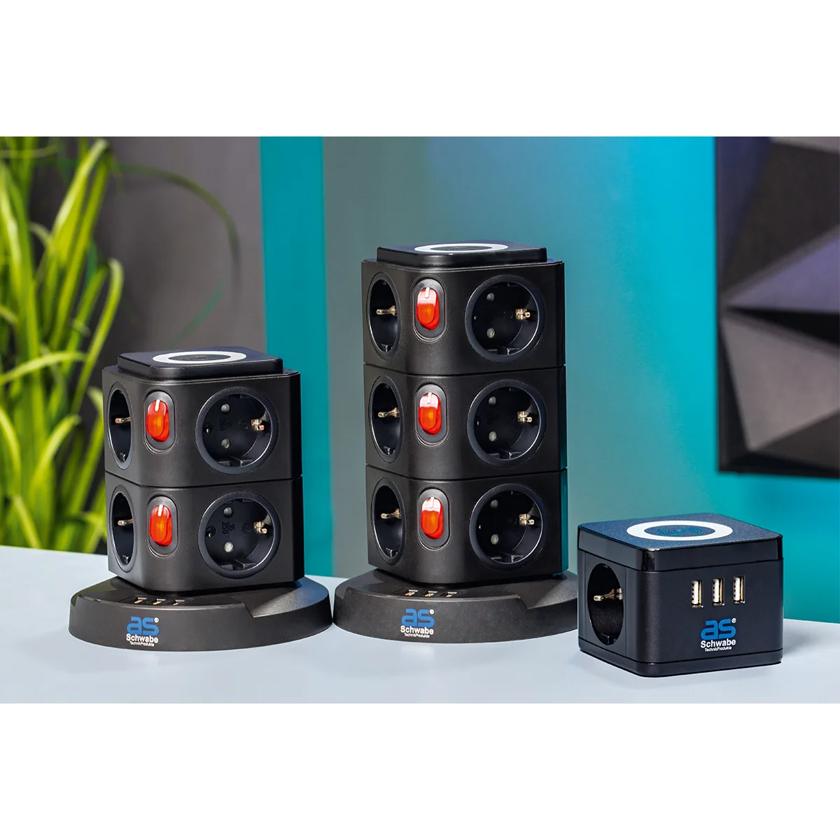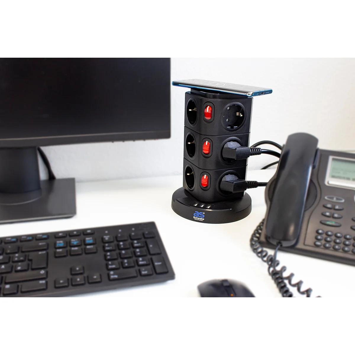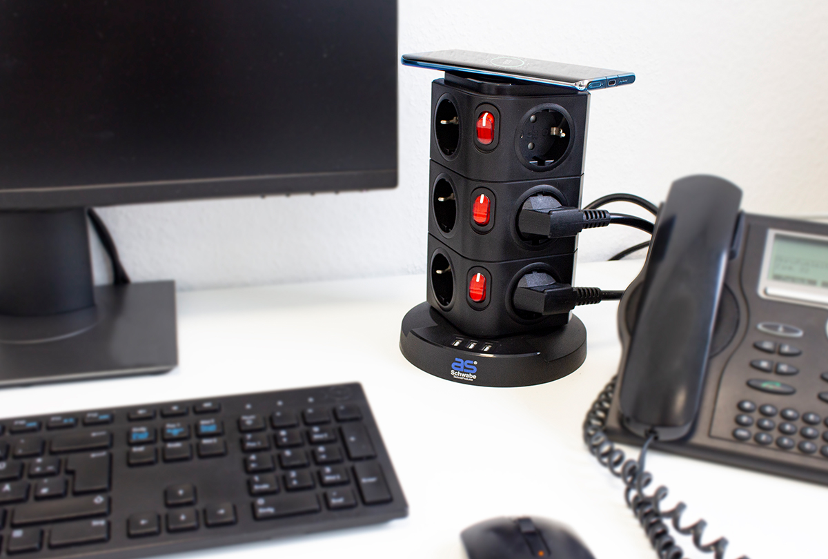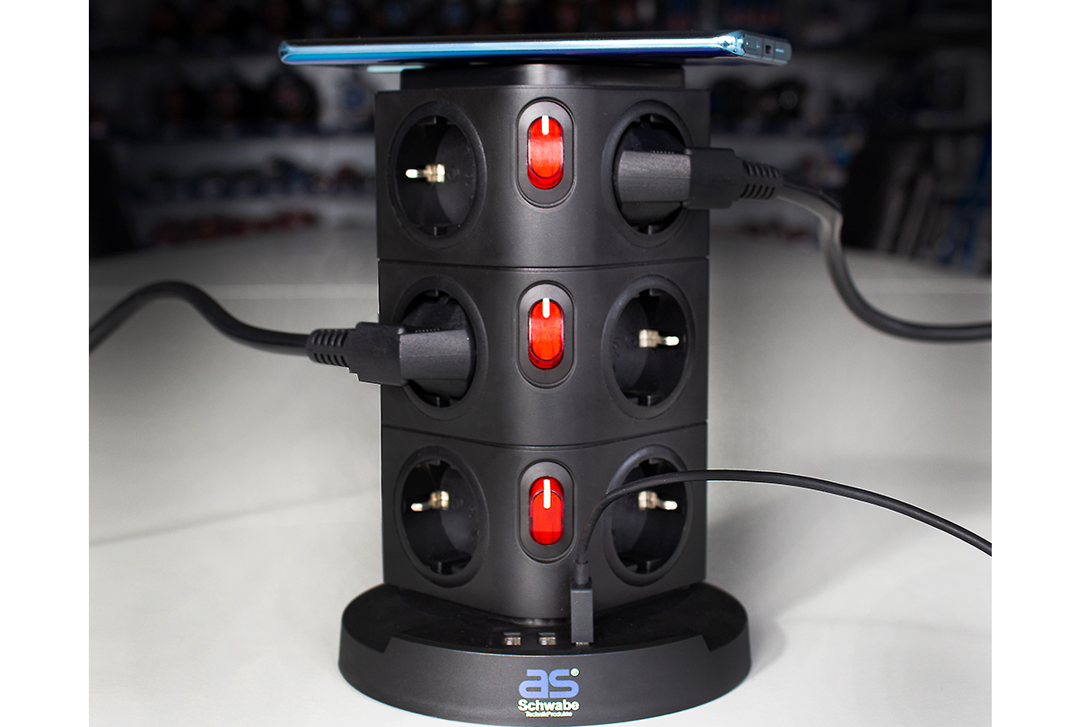 Thanks to its unusual horizontal design, this multiple socket outlet offers much more space than conventional multiple socket outlets. Even when using various devices at the same time, it never looks untidy, no more cable chaos! 12 earthed sockets + 3 USB ports, suitable for charging different devices at the same time, inductive charging station on top for all induction-compatible mobile phones, ideal for the office and home.