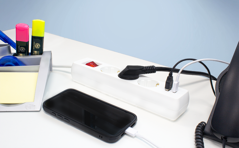 Ob Laptop, Monitor, Beleuchtung oder Smartphone – mit 3 Schutzkontakt-Steckdosen and 2 USB-Ports (USB-A bis 18 W / USB-C bis 20 W) versorgst du mehrere Geräte gleichzeitig und effizient mit Energie.