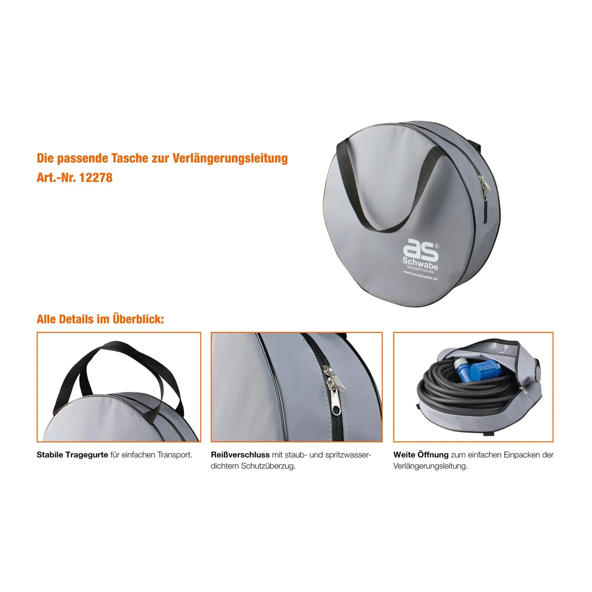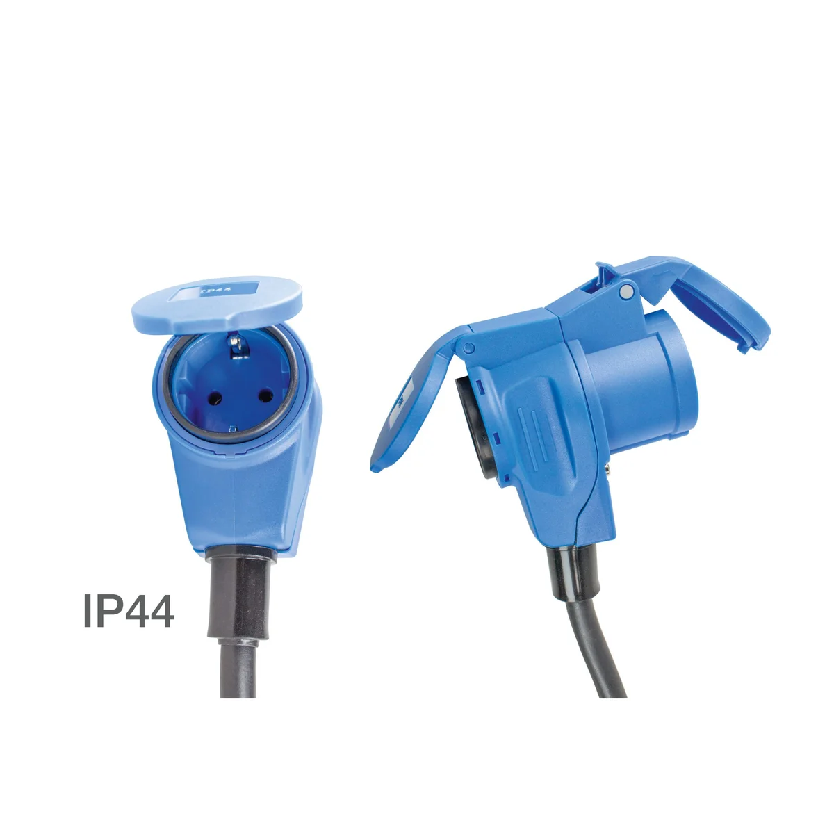 In terms of safety when handling electricity, it is also advisable to use electrical products with a cable length of no less than 1.5 metres. This cable length makes it possible, for example, to connect extension cables to a higher wall socket or feed socket and to lay the cable with the coupling on the floor, e.g. under the vehicle. The advantage of this is that there is no tensile load on the connection between the plug and coupling after connecting a consumer. In addition, there is no load on the supply plug. Tensile stress should always be avoided on these two connections, as in the worst case scenario, loose contact connections can cause socket fires. Short circuits can also cause damage to the connected appliances. If you want to be on the safe side, follow our tip and only use products with a minimum cable length of 1.5 metres.