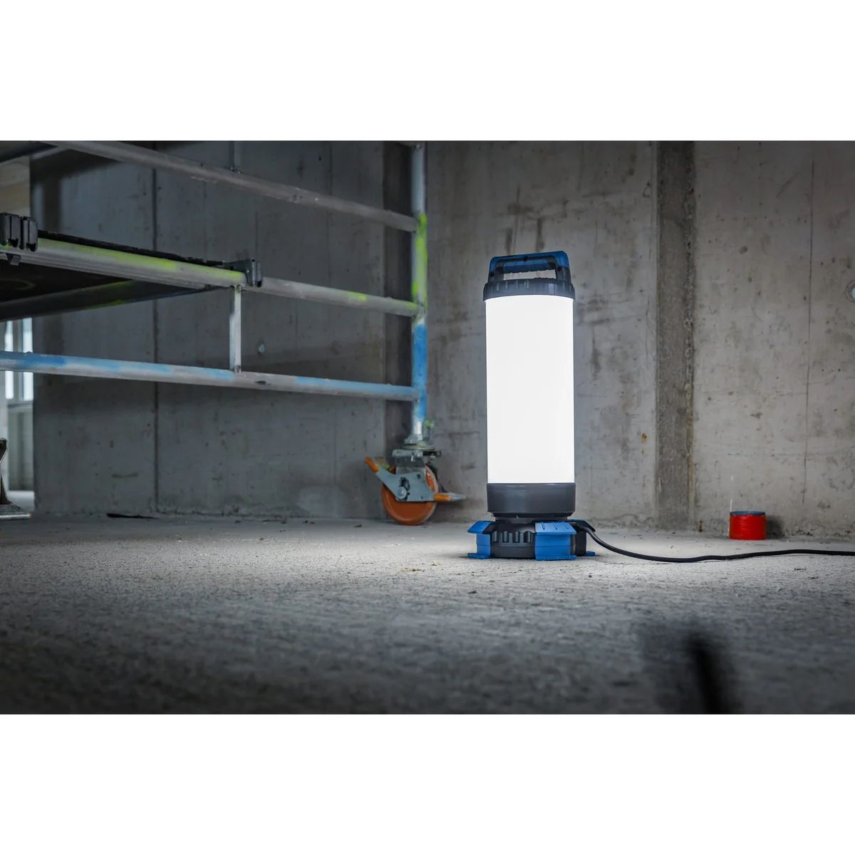 Robust LED construction spotlight for indoor and outdoor areas with 360° all-round lighting. The colour temperature can be flexibly adjusted between 3000 K, 4500 K and 6500 K, four switching levels ensure optimum light adjustment. With a light output of 16,500 lumens, impact-resistant polycarbonate cylinder (IK08), ergonomic handle and IP54 protection, the spotlight is ideal for demanding working environments. The aluminium heat sink and easy mounting on DIN spigots (Ø 25-32 mm) make the device particularly versatile.
