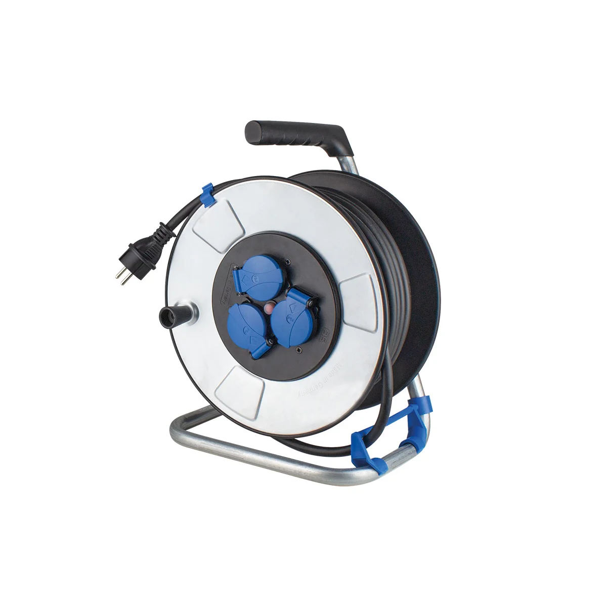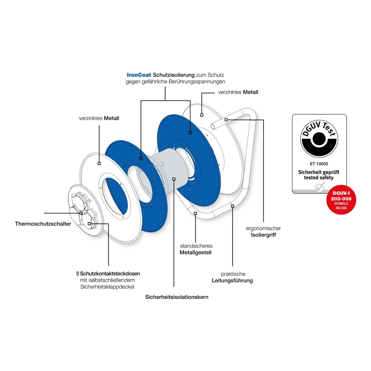 IronCoat metal cable reels combine the advantages of a classic sheet steel cable reel with improved protection against dangerous contact voltages. The special patented protective insulation of the side parts protects against electric shocks caused by defective cable harnesses when the cable is rolled up. This means that no current can be passed from the inside to parts of the cable reel that can be touched over a large area, which guarantees protection against serious damage to health.
