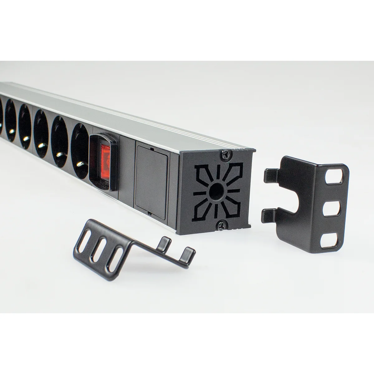Das stabile Aluminiumgehäuse ensures high load capacity in professional IT environments. The 45°-Anordnung der sieben Steckdosen facilitates the connection of larger power supplies and, through the increased touch protection, provides additional safety. For maximum flexibility, the included mounting clips allow a horizontale, vertikale oder um 30° geneigte Installation.