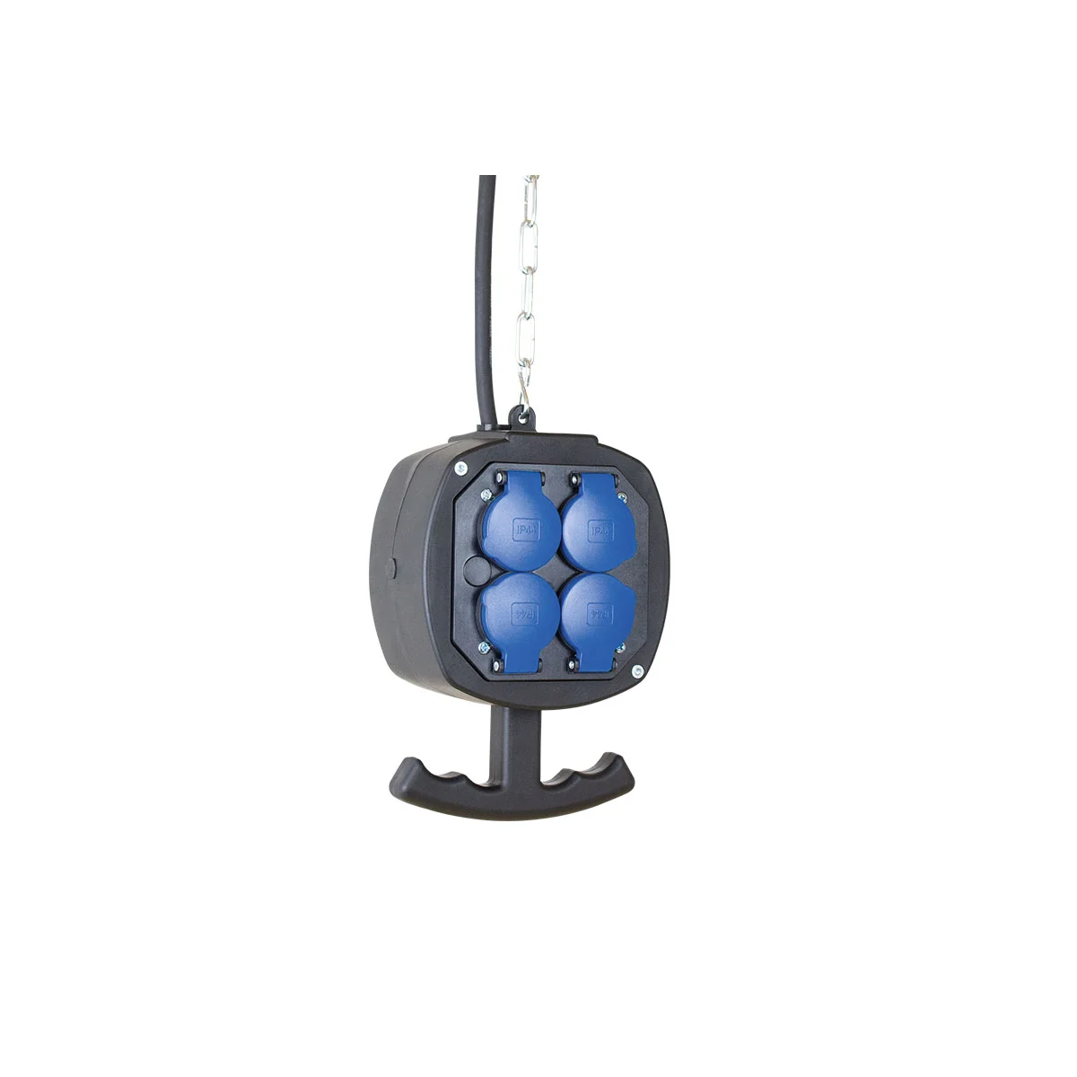8x socket outlets with earthing contact, 230 V, 16 A, with hinged lids, four each on the front and rear.