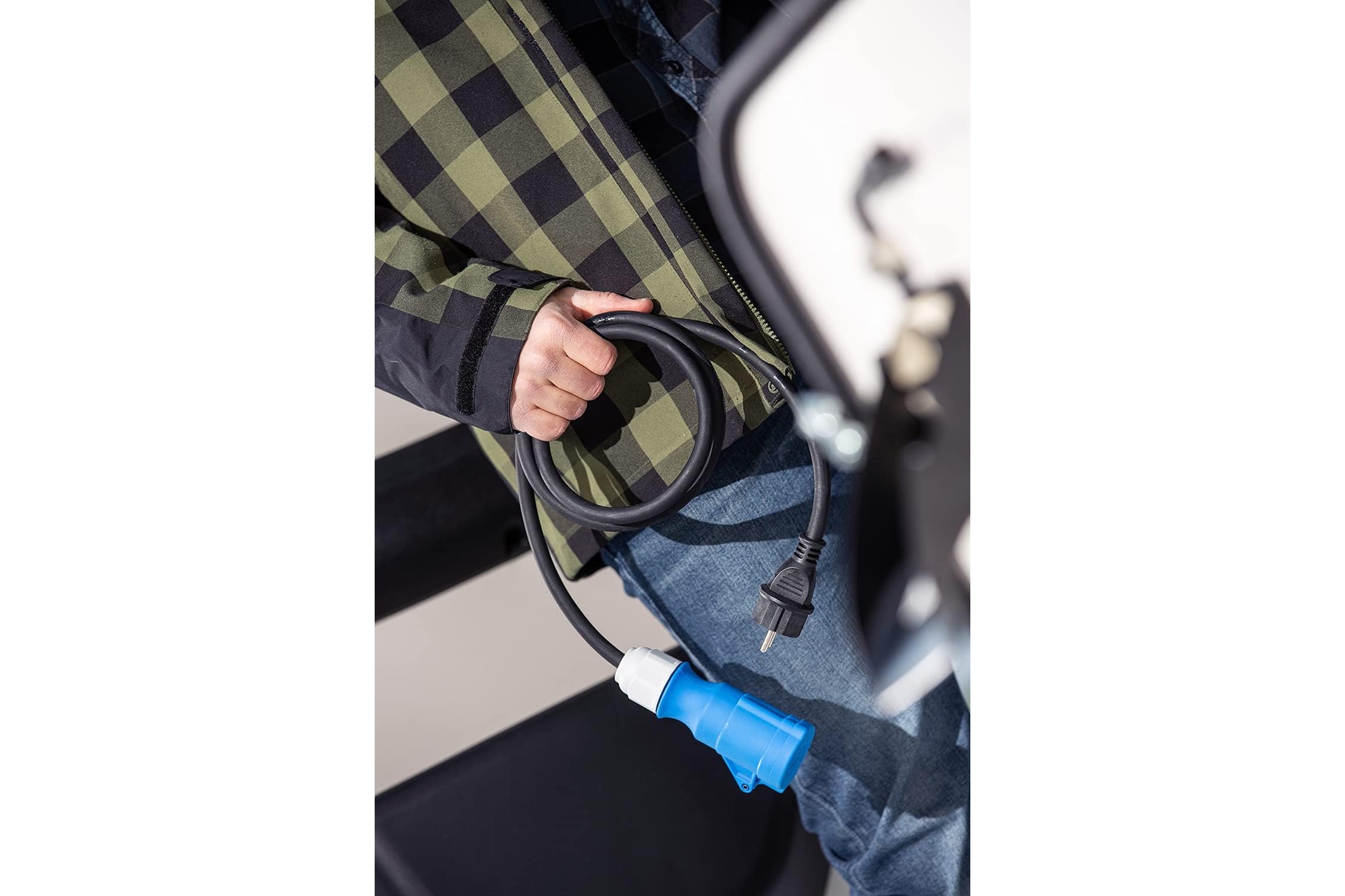 Przedłużacz adapter CEE 230 V, 16 A, 3P o długości 1,5 m jest idealnym rozwiązaniem do zastosowań zarówno w warunkach domowych, jak i profesjonalnych. Wyposażony w wytrzymały kabel H07RN-F 3G2,5, przystosowany do pracy na zewnątrz, zapewnia wysoką ochronę przed niekorzystnymi warunkami atmosferycznymi dzięki klasie szczelności IP44. W zestawie znajduje się praktyczna taśma Velcro z metalowym uszkiem, umożliwiająca łatwe zawieszanie urządzenia. Adapter oferuje jedno gniazdo CEE 230 V, 16 A, 3P oraz sygnalizację napięcia Powerlight, co zwiększa komfort użytkowania i bezpieczeństwo. Maksymalne obciążenie wynoszące 3500 W sprawia, że jest to produkt odpowiedni do zasilania różnych urządzeń elektrycznych w warunkach zewnętrznych.