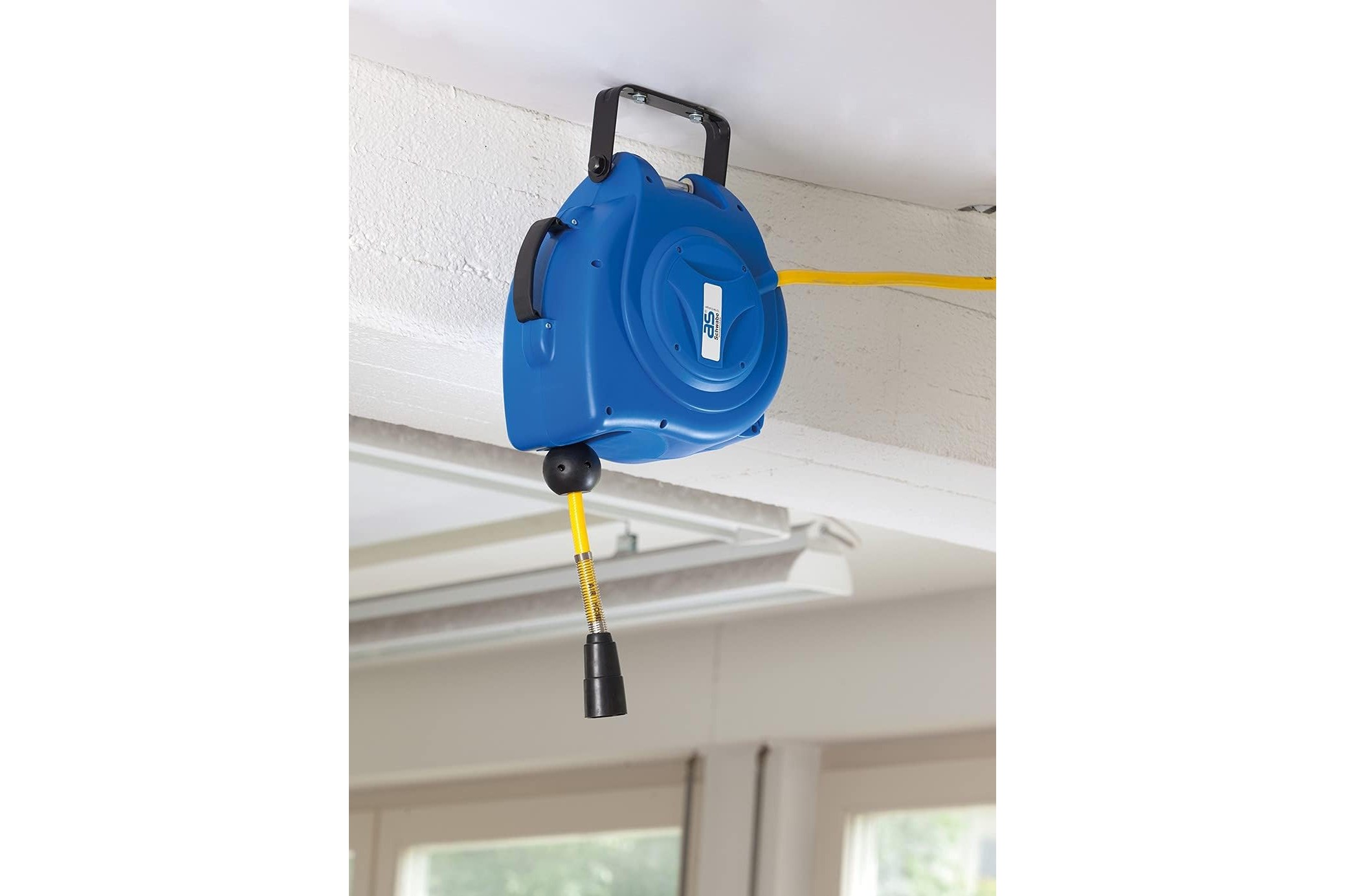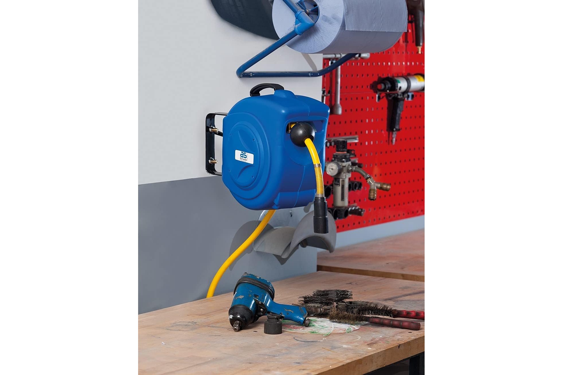 - bęben na wąż sprężonego powietrza z wytrzymałą, niebieską obudową z tworzywa sztucznego