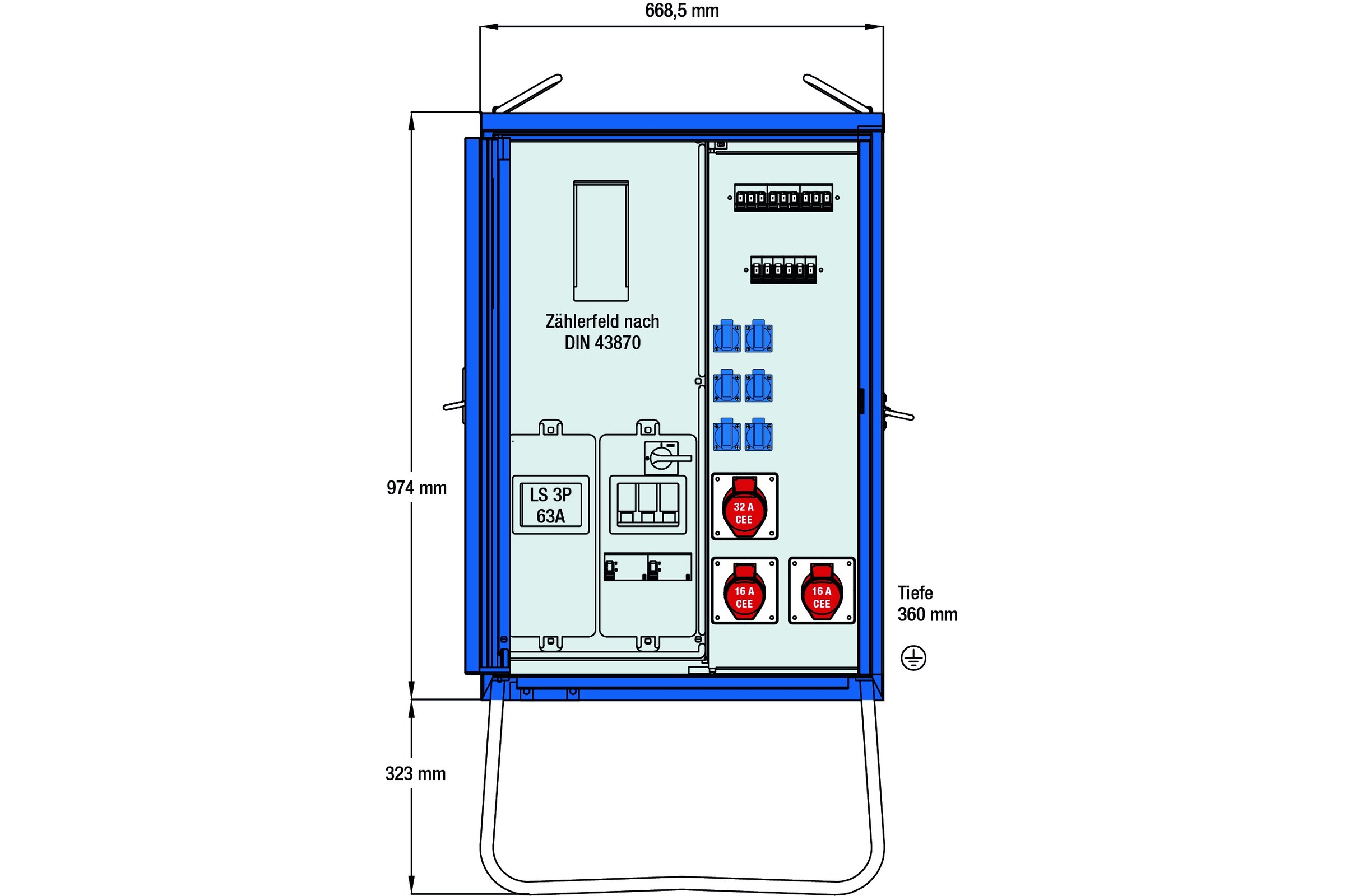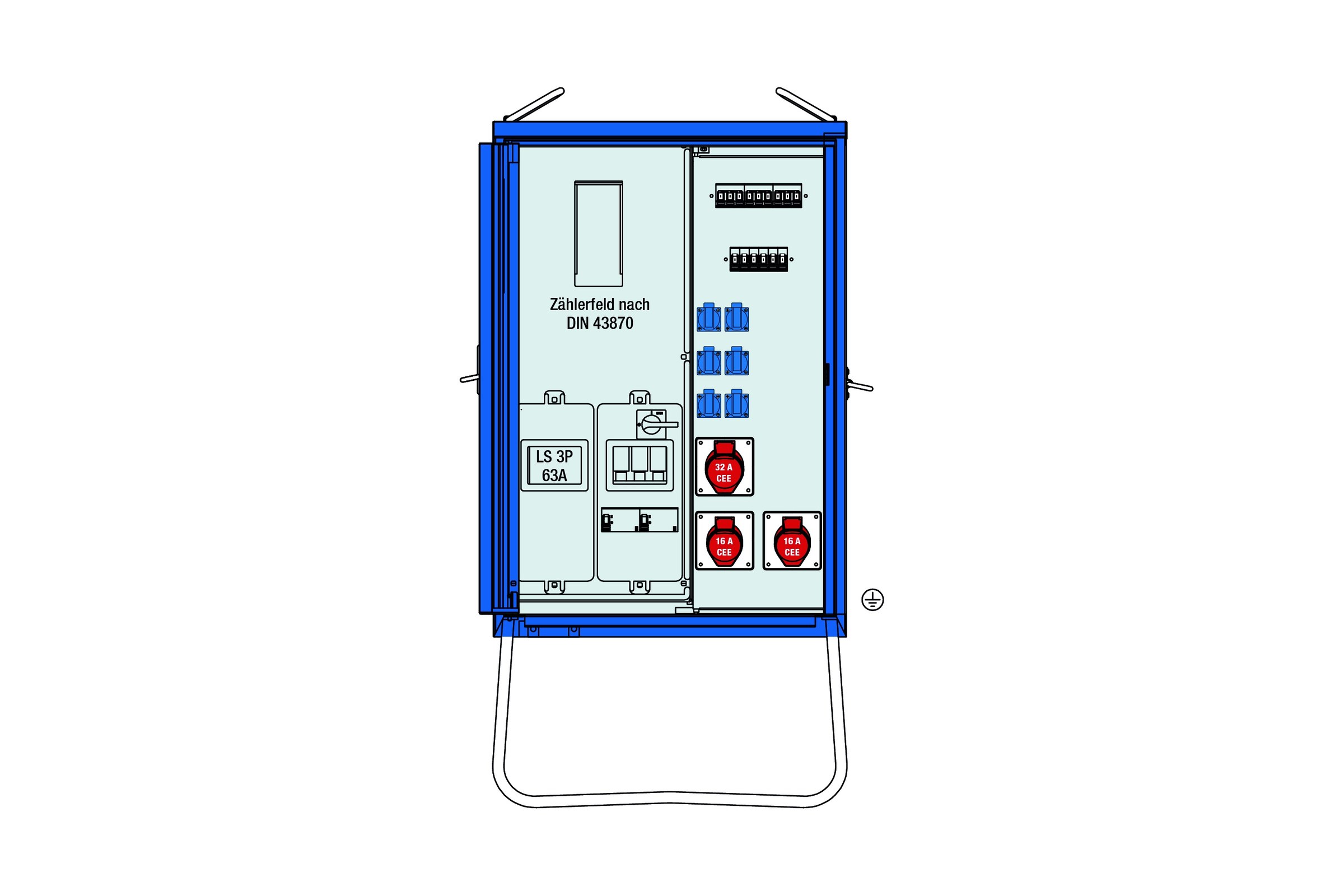 - rozdzielnica budowlana w stabilnej stalowej szafce pokrytej wytrzymałą powłoką z tworzywa sztucznego w niebieskim kolorze