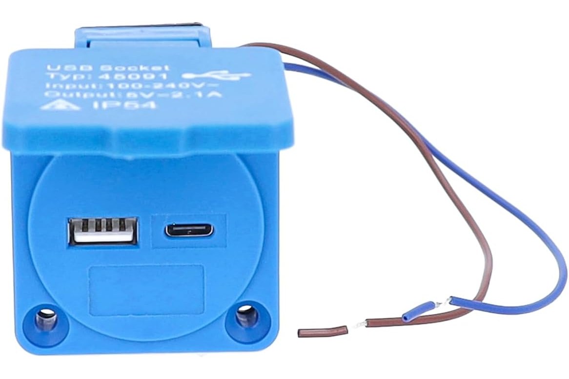 Gniazdo z dwoma portami USB (1x USB-A i 1x USB-C) to nowoczesne rozwiązanie do szybkiego i bezpiecznego ładowania urządzeń mobilnych. Dzięki szerokiemu zakresowi napięcia wejściowego 100–230 V oraz wyjściu 5 V / 2,1 A DC, zapewnia stabilne i wydajne zasilanie smartfonów, tabletów czy akcesoriów elektronicznych. Kompaktowa konstrukcja z kołnierzem o wymiarach 50×50 mm i rozstawem otworów 38×38 mm ułatwia montaż w różnych systemach zabudowy. Stopień ochrony IP54 gwarantuje odporność na kurz i wilgoć, co sprawia, że produkt idealnie nadaje się zarówno do zastosowań domowych, jak i przemysłowych. To praktyczne, uniwersalne gniazdo łączy w sobie funkcjonalność, estetykę i niezawodność.