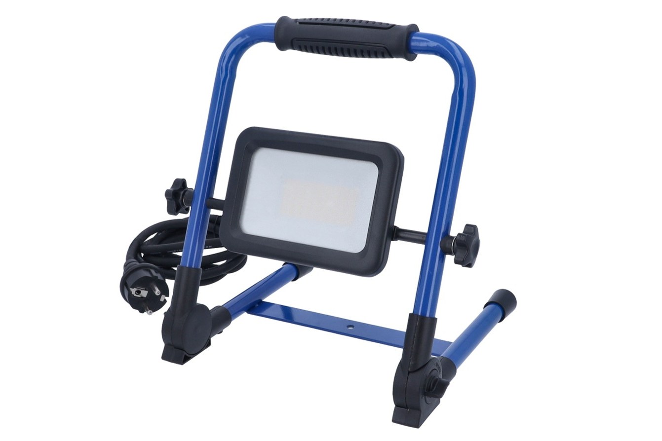 Optiline LED 50W to przenośny reflektor o doskonałej efektywności 120 lm/W, zapewniający strumień świetlny 6000 lm w barwie 4000 K. Wyróżnia się trwałą konstrukcją z odporną na uderzenia obudową z aluminium i tworzywa, a satynowana szybka gwarantuje przyjemne, nieoślepiające światło. Dzięki składanej niebieskiej ramie i kompaktowym wymiarom reflektor łatwo przenieść i ustawić w dowolnym miejscu. Wysoki stopień ochrony IP44 oraz żywotność ponad 40 000 godzin czynią go niezawodnym towarzyszem codziennej pracy.