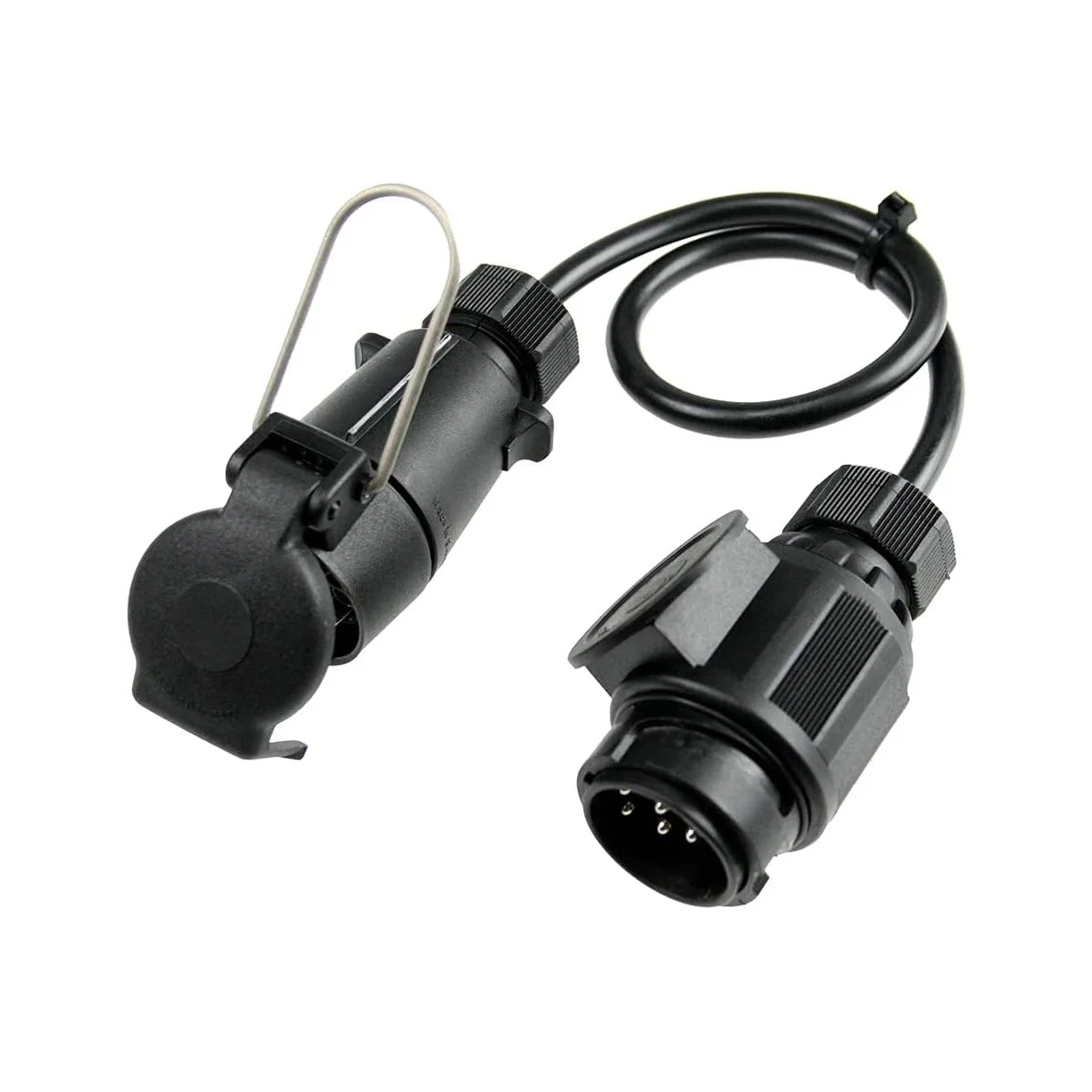 Przedłużacz adapter samochodowy to funkcjonalne rozwiązanie, które umożliwia łatwe połączenie urządzeń elektrycznych w pojazdach z wtyczką 13-pinową. Wyposażony w przewód zasilający H05VV-F o długości 0,6 m i średnicy 7×1,0 mm², zapewnia stabilne zasilanie o napięciu 12 V DC. Jego gniazdo 7-pin z uchylną klapką jest przystosowane do użytku na zewnątrz, a certyfikat IP44 gwarantuje odporność na działanie wilgoci oraz pyłu. Produkt jest idealny do zastosowań w campingach, warsztatach, a także w codziennej eksploatacji pojazdów, zwiększając komfort użytkowania i bezpieczeństwo podłączeń elektrycznych.