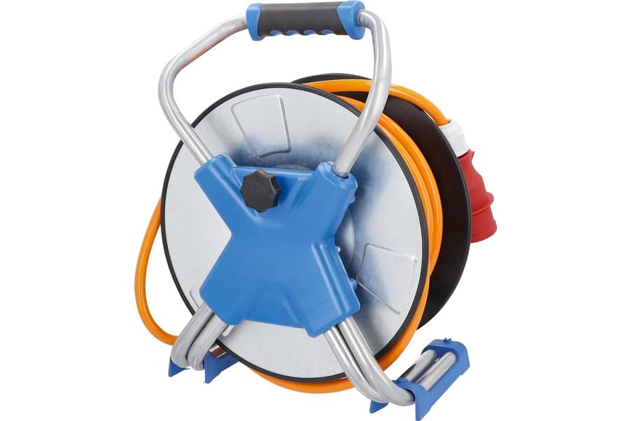Przedłużacz bębnowy wzmacniany „IronCoat“ Xperts to niezawodne narzędzie, zaprojektowane z myślą o zastosowaniach w wymagających warunkach, takich jak budowy oraz prace na zewnątrz. Charakteryzuje się wejściem H07BQ-F 5G2,5 o długości 25 m, zakończonym wtyczką CEE 400 V, 16 A, 5P, co zapewnia stabilne zasilanie urządzeń o mocy do 11 kW. Wzmocniony metalowy stelaż oraz plastikowa szpula z dodatkowymi elementami metalowymi gwarantują trwałość i odporność na uszkodzenia mechaniczne. Urządzenie wyposażono w ergonomiczny uchwyt oraz hamulec, co ułatwia jego transport i użytkowanie. Dodatkowo, przedłużacz posiada jedno gniazdo CEE 400 V oraz dwa gniazda IP44 z klapką, co zapewnia wszechstronność zastosowań oraz bezpieczeństwo pracy na zewnątrz, spełniając normy IP44.