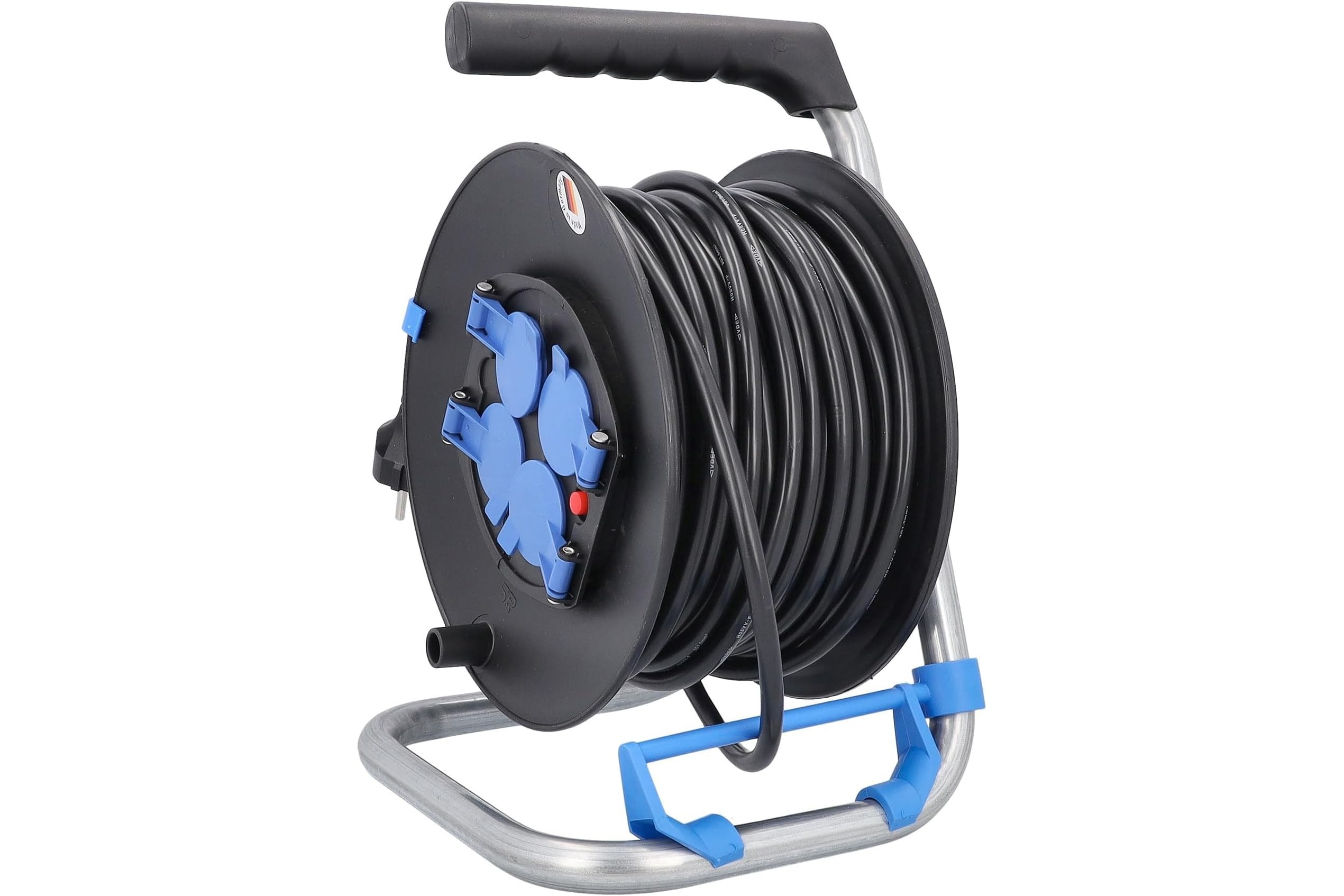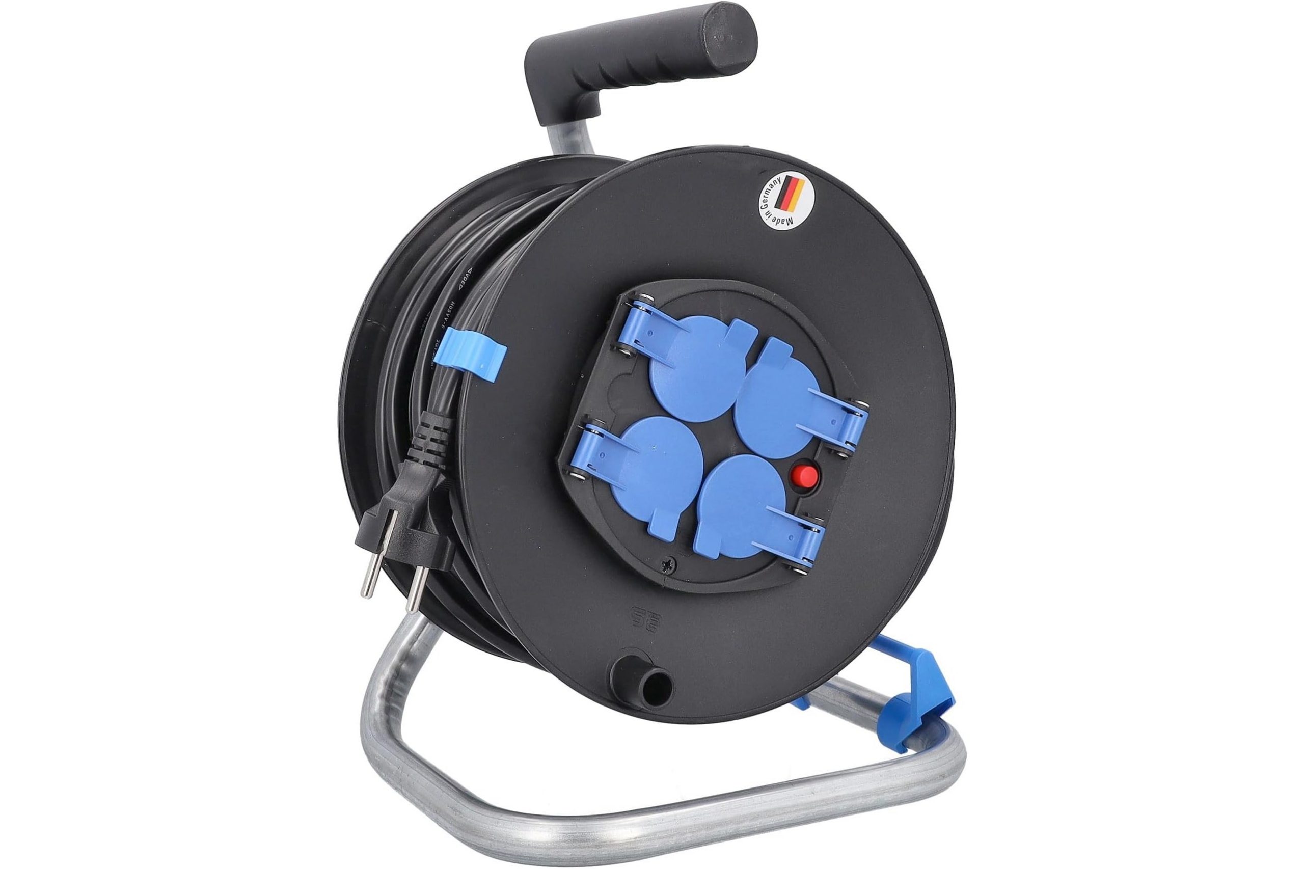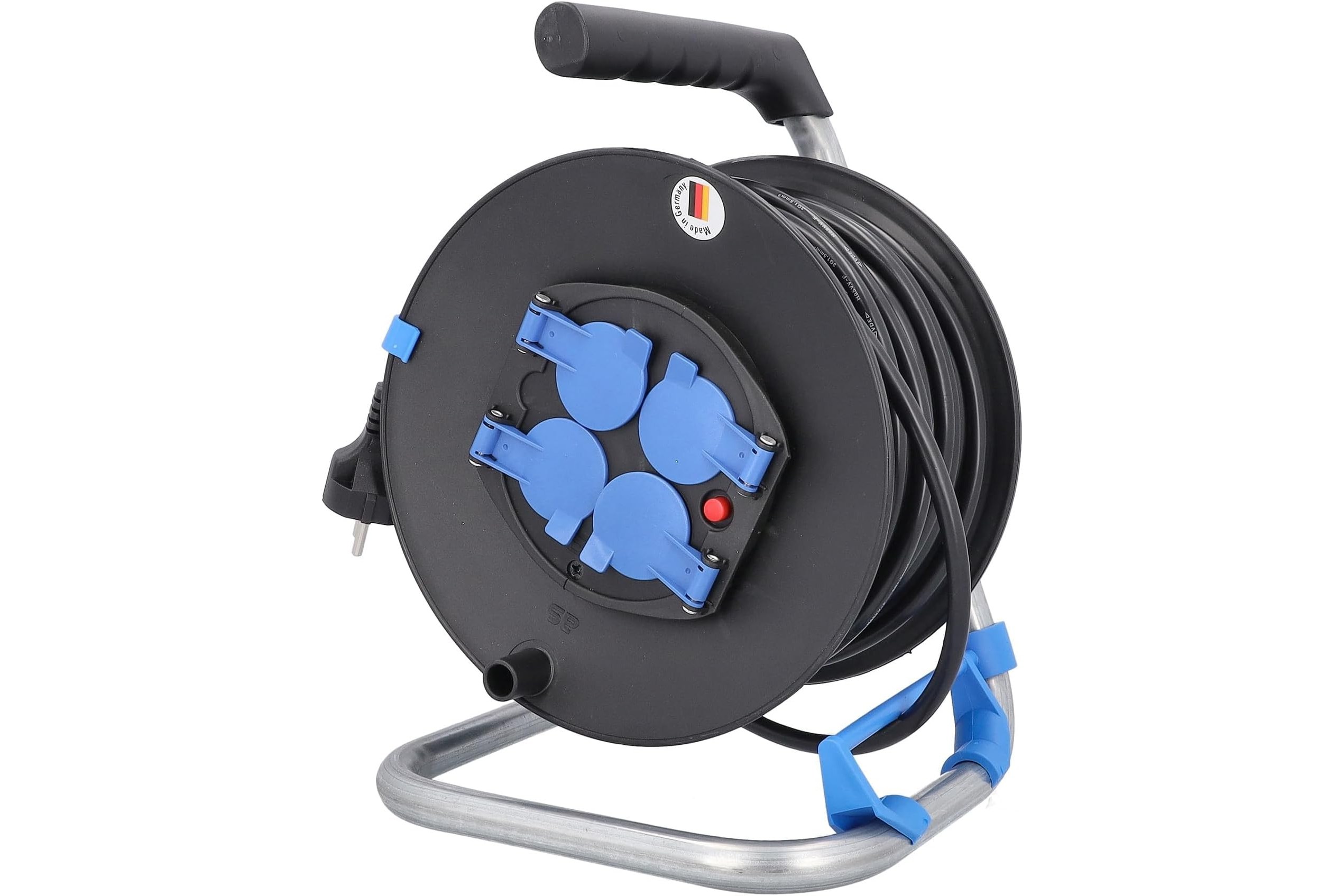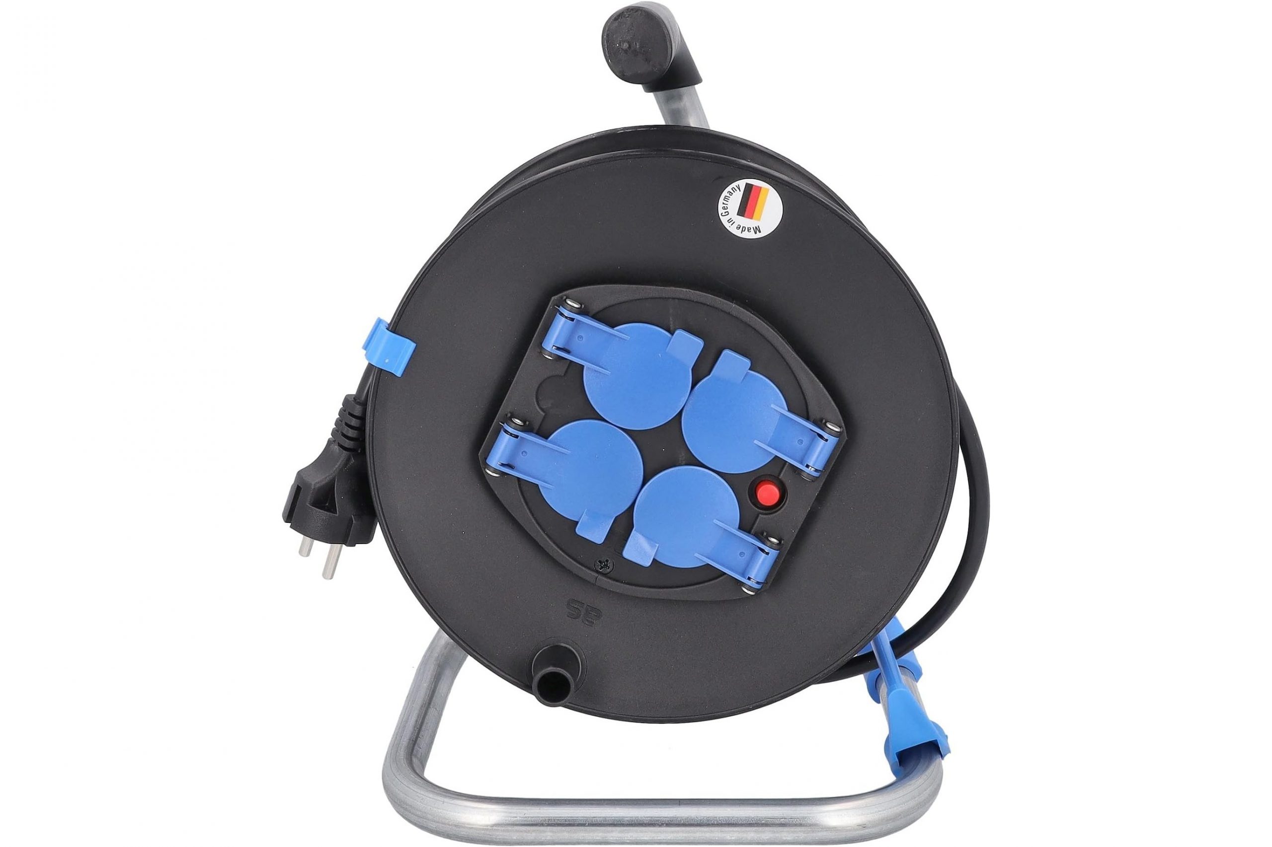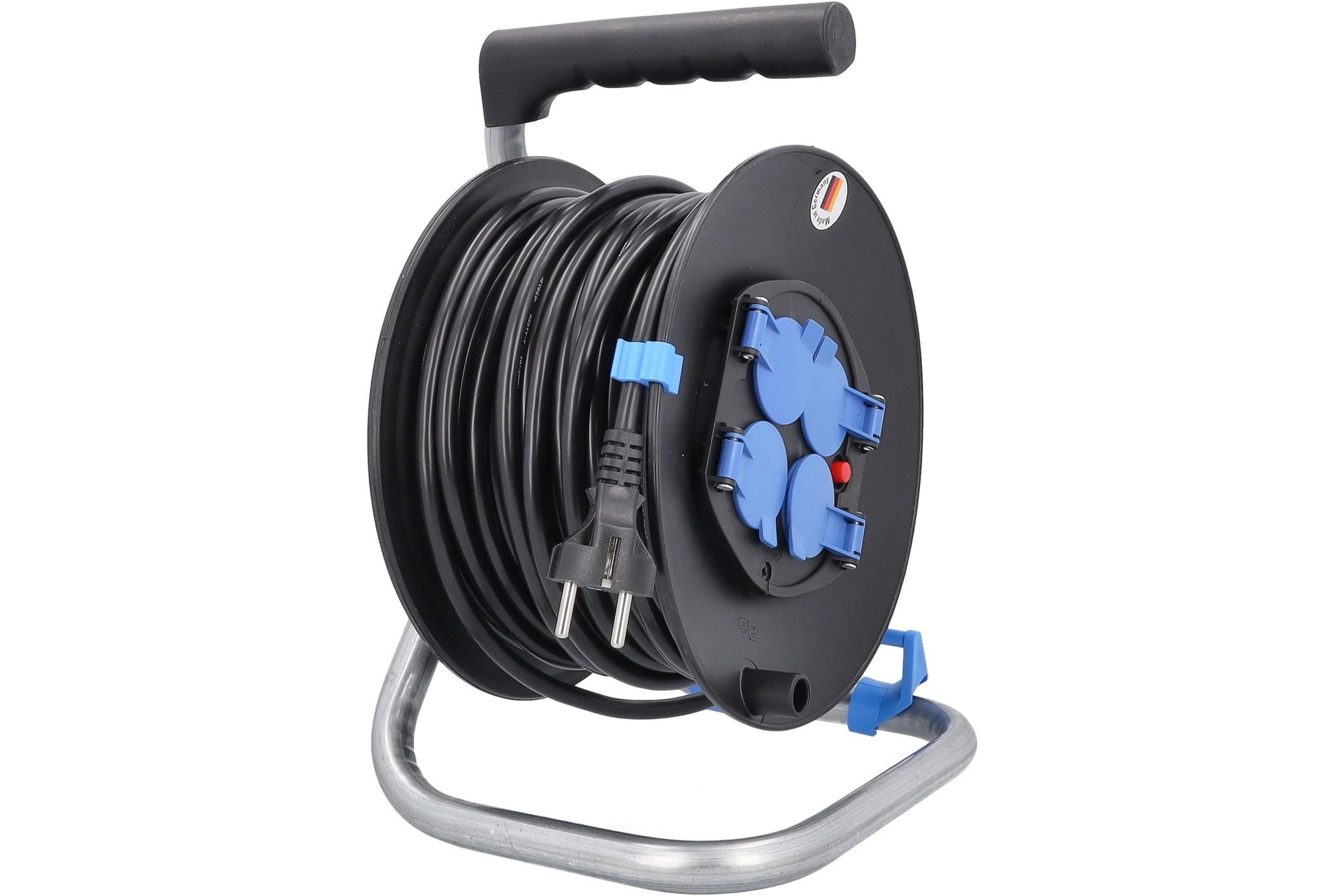 Przedłużacz bębnowy plastikowy o średnicy 285 mm, wyposażony w 50-metrowy kabel H05VV-F 3G1,5, to idealne rozwiązanie do użytku wewnętrznego w różnych aplikacjach elektrycznych. Jego solidna konstrukcja, obejmująca metalowy stelaż oraz plastikową szpulę w kolorze czarnym, zapewnia trwałość i wygodę użytkowania. Produkt oferuje cztery gniazda IP20 z klapką niebieską, umożliwiające podłączenie urządzeń o maksymalnej mocy 3500 W (230 V, 16 A). Dodatkowo, przedłużacz został wyposażony w termik, hamulec oraz uchwyt z tworzywa, co zapewnia bezpieczeństwo i stabilność podczas eksploatacji. Dzięki prowadnicy do kabla, użytkownik zyskuje łatwość w zarządzaniu długością przewodu, co zwiększa komfort użytkowania.