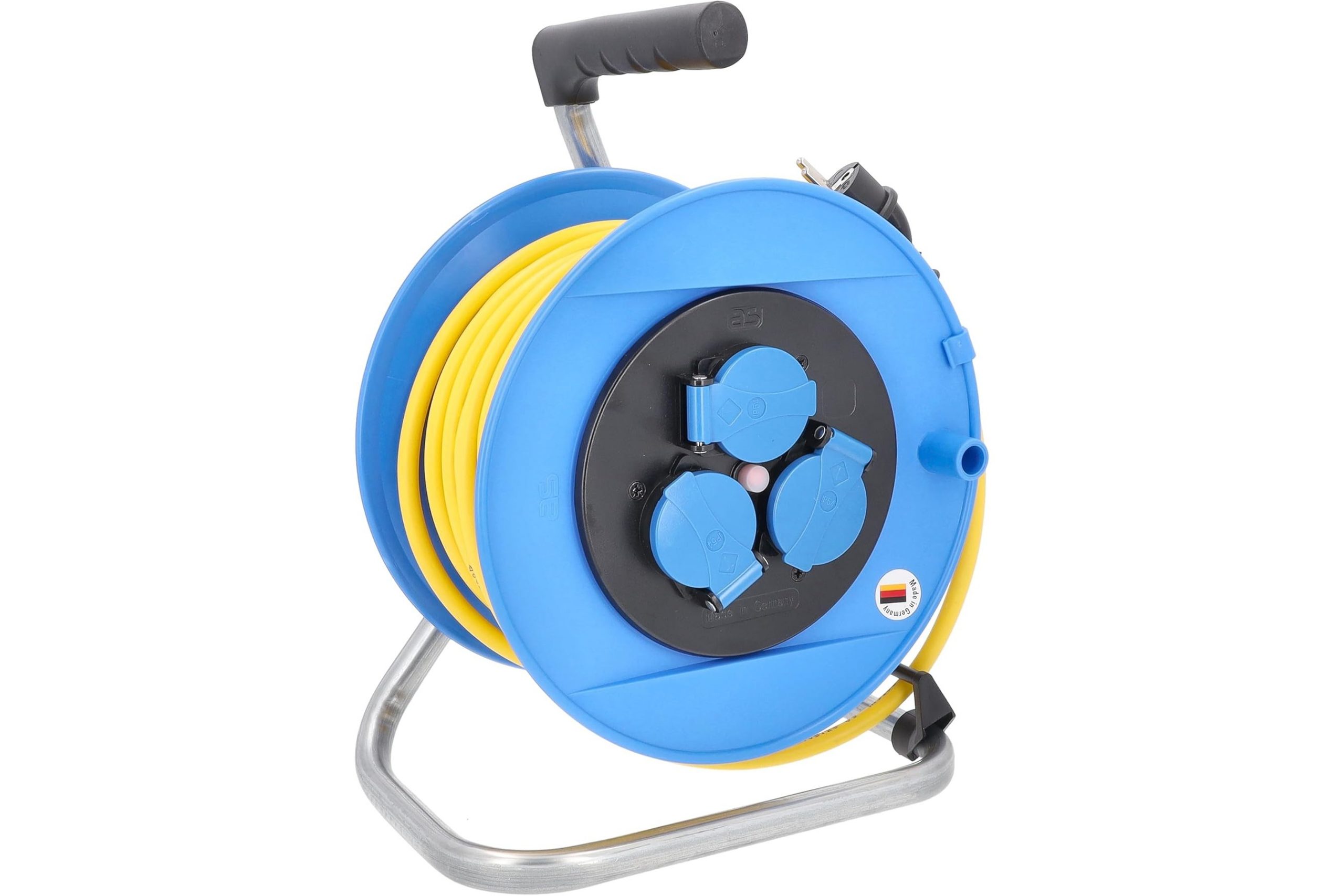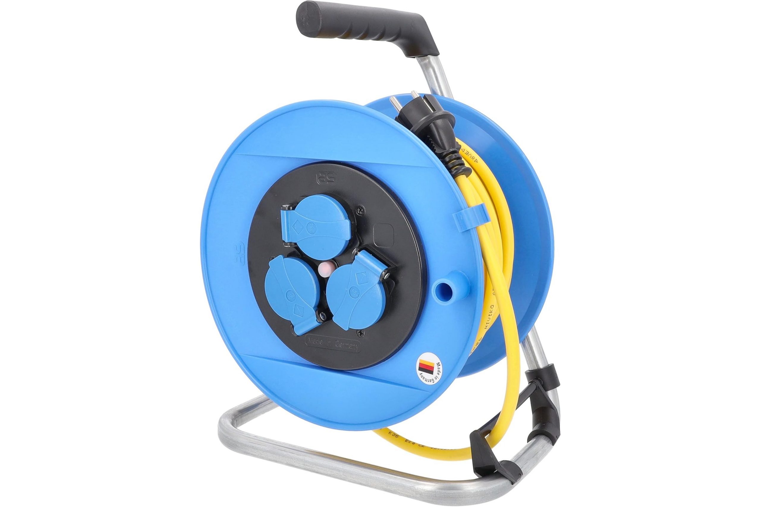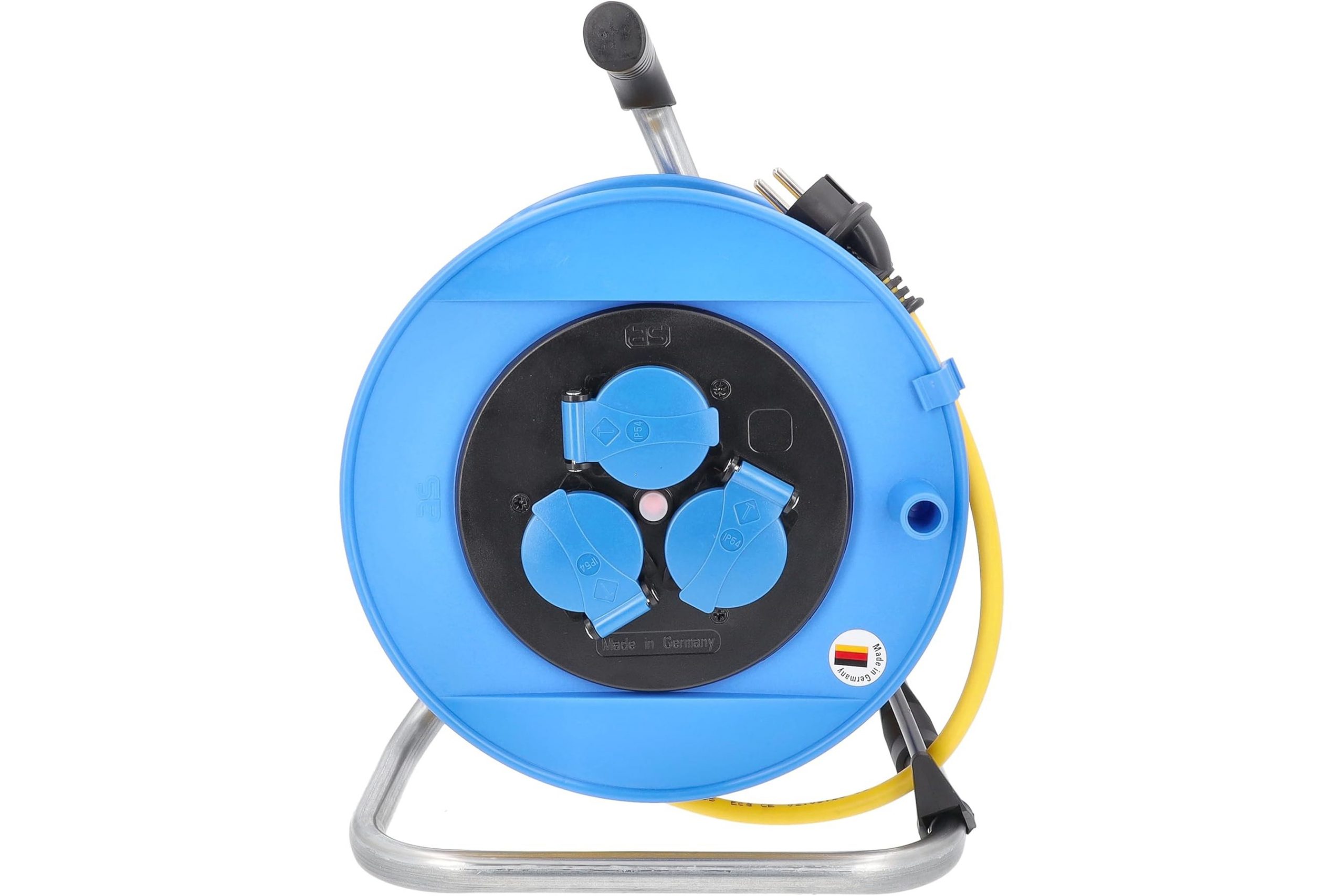 Przedłużacz bębnowy plastikowy o średnicy 285 mm to idealne rozwiązanie dla zastosowań zewnętrznych oraz na budowach, spełniający normy IP44. Model promocyjny wyposażony jest w wytrzymałą szpulę w kolorze niebieskim, stelaż metalowy oraz łatwą w obsłudze prowadnicę do kabla. Oferuje trzy gniazda z uziemieniem (2P+Z) o maksymalnym obciążeniu 230 V i 16 A, co pozwala na jednoczesne zasilanie kilku urządzeń. Dodatkowo, wtyczka AT-N07V3V3-F 3G1,5 i termik zapewniają bezpieczeństwo użytkowania, a hamulec stabilizuje pozycję w trakcie pracy. Przedłużacz o długości 25 m jest nie tylko funkcjonalnym urządzeniem, ale również znacząco podnosi komfort pracy w trudnych warunkach.
