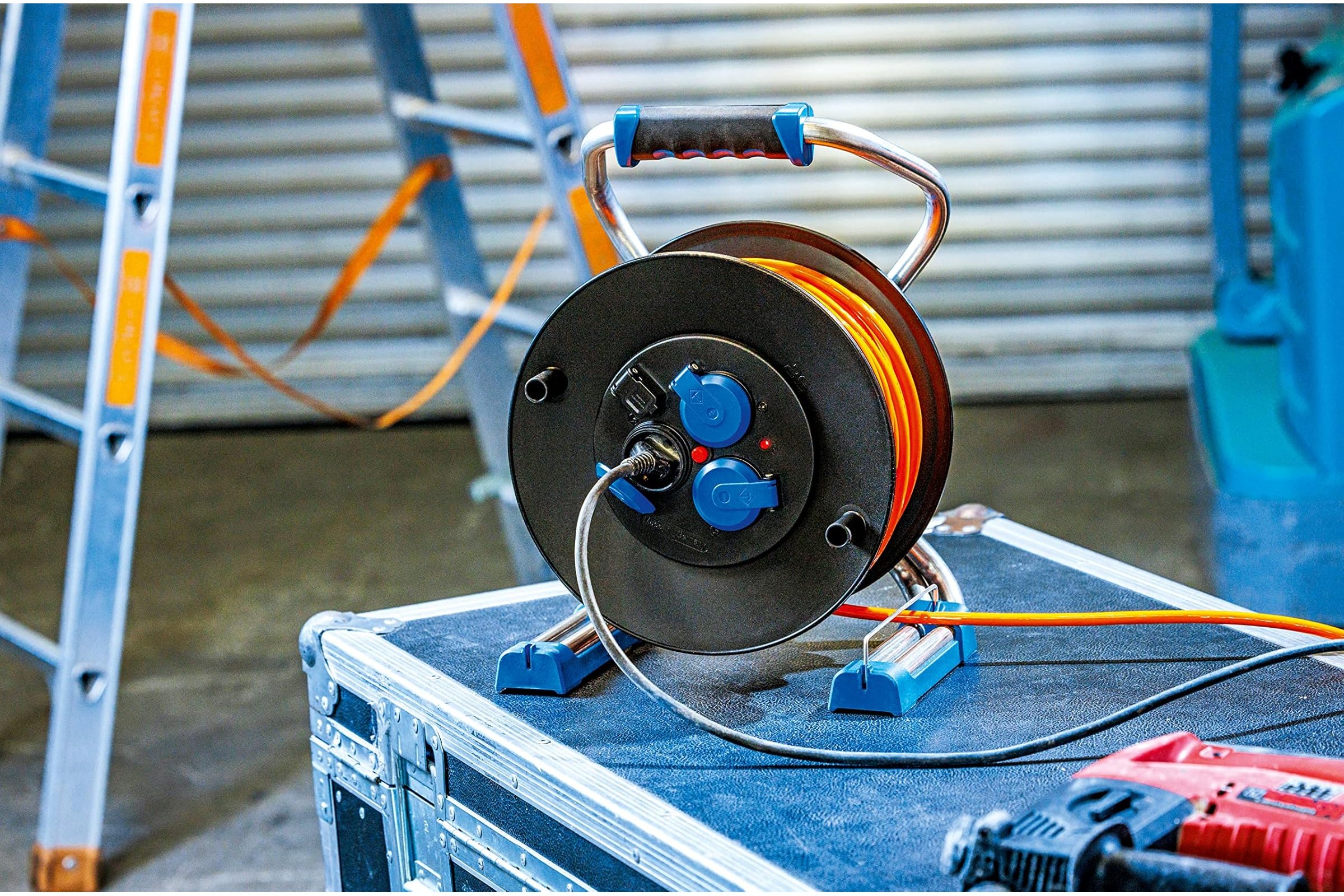 Przedłużacz bębnowy plastikowy Xperts o średnicy 320 mm to doskonałe rozwiązanie zarówno do użytku zewnętrznego, jak i na budowie. Wyposażony w 50-metrowy kabel H07BQ-F 3G1,5, oferuje trzy gniazda IP44 z klapką oraz jedno złącze USB 5 V, 1 A, co zapewnia wszechstronność w zasilaniu różnych urządzeń elektrycznych. Solidny stelaż metalowy, wykonany z podwójnych rur, gwarantuje stabilność i wytrzymałość, a ergonomiczny uchwyt oraz hamulec ułatwiają transport i użytkowanie. Produkt charakteryzuje się maksymalnym obciążeniem 230 V, 16 A i 3500 W oraz sygnalizacją napięcia i zabezpieczeniem termicznym, co wpływa na bezpieczeństwo jego eksploatacji. Dzięki klasie ochrony IP44, przedłużacz jest odporny na warunki atmosferyczne, co czyni go idealnym rozwiązaniem w trudnych warunkach pracy.