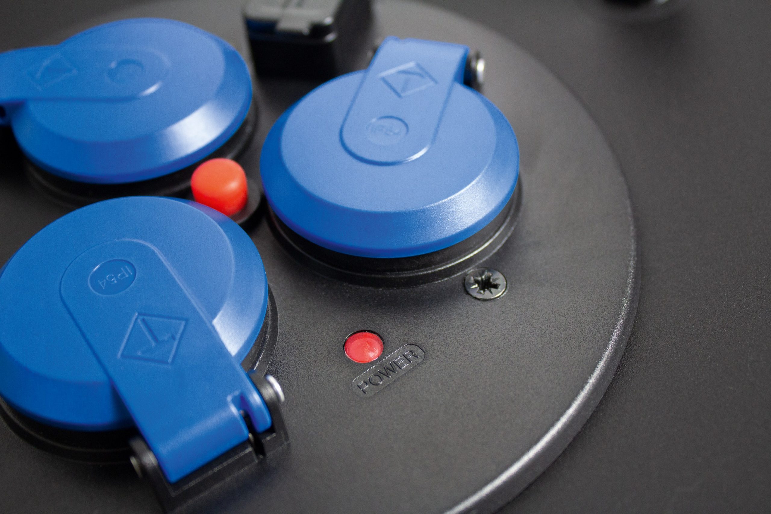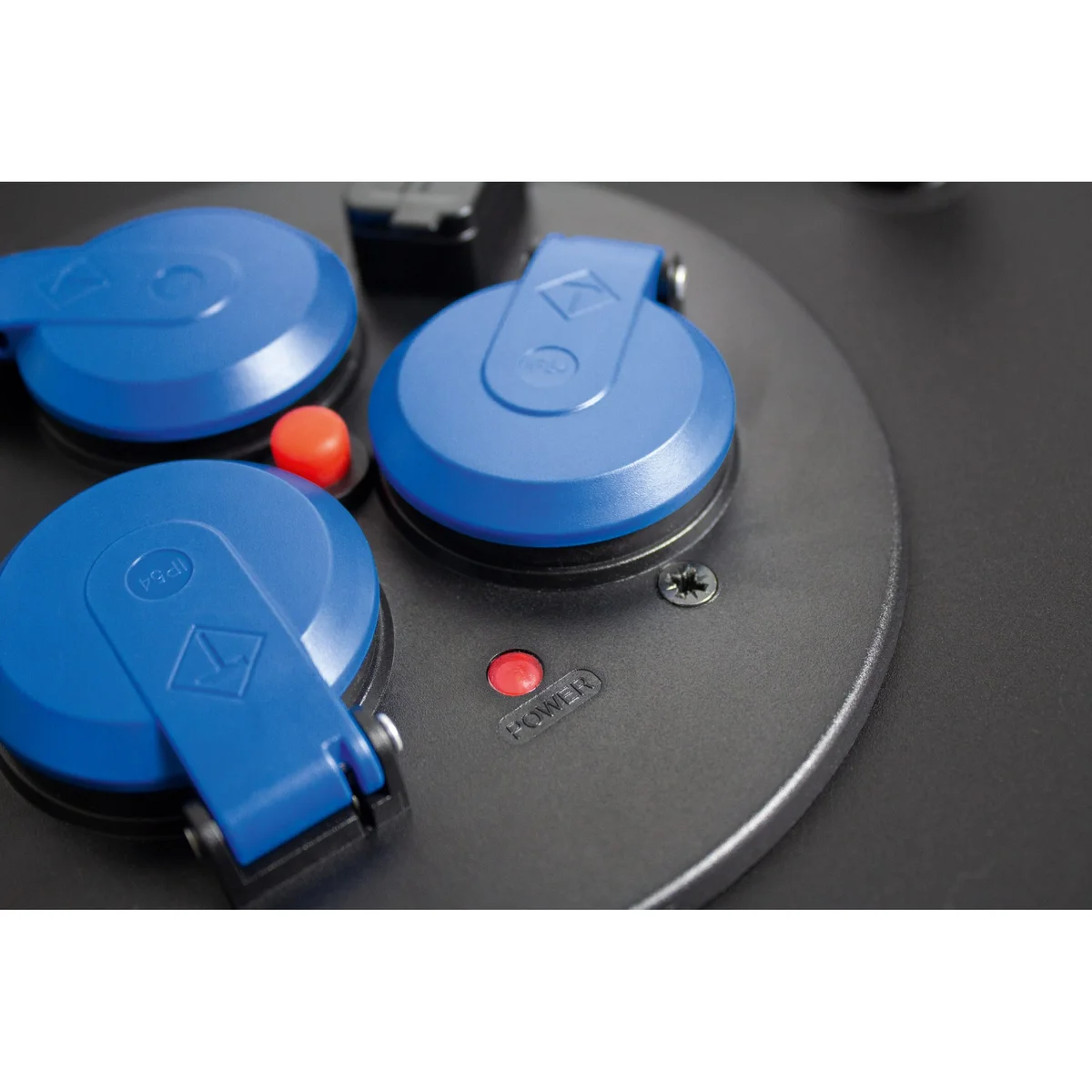 | Wyjście | 3x gniazdo IP44 z niebieską klapką z uziemieniem 230 V, 16 A, 2P+Z "F" |