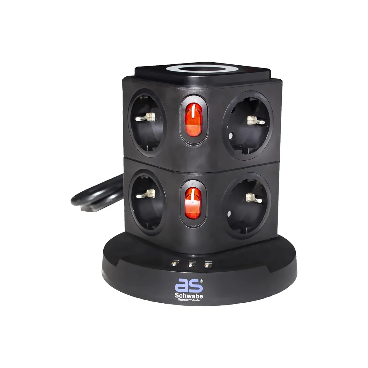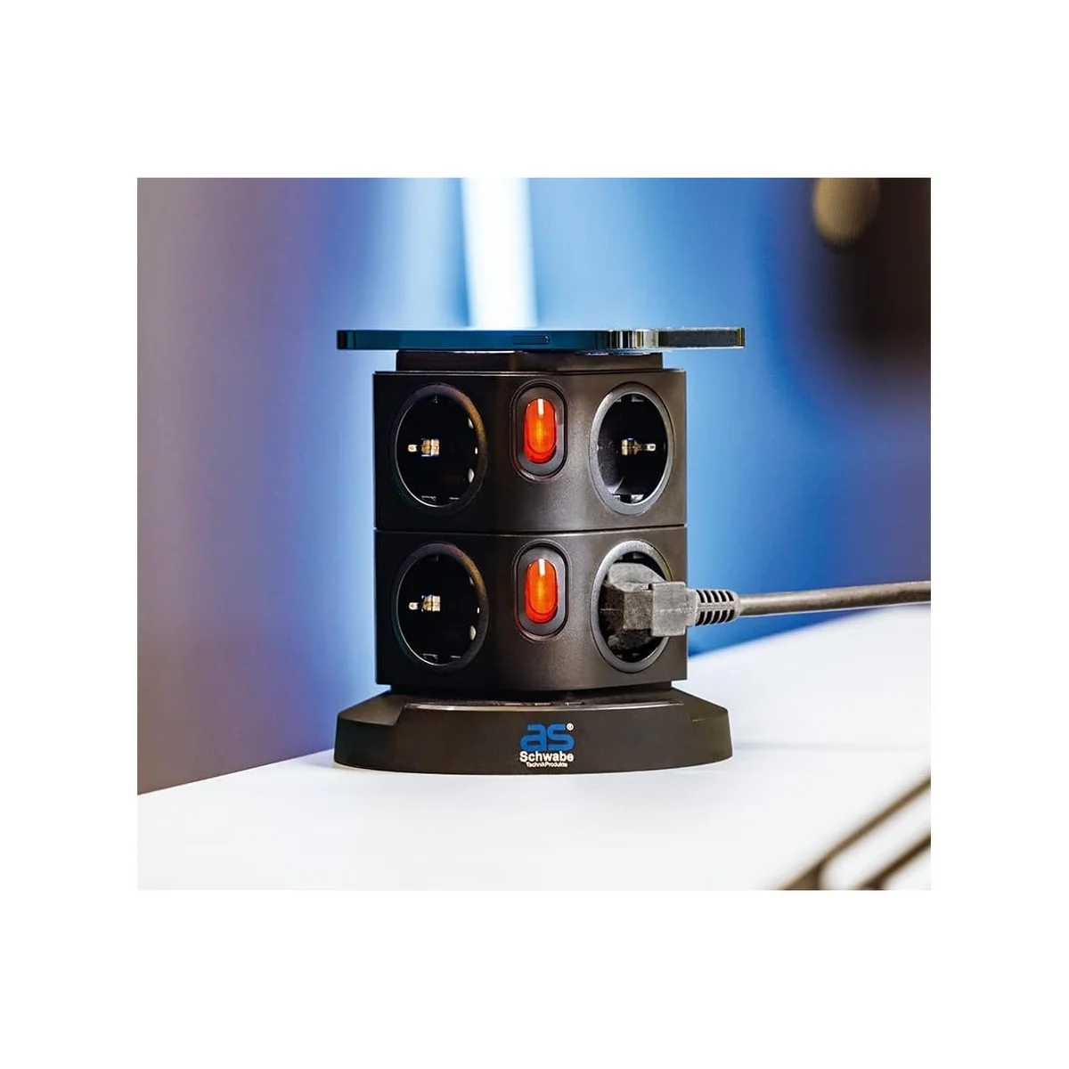 - z 2 podświetlanymi włącznikami do włączania i wyłączania, po 4 gniazda z uziemieniem na poziom