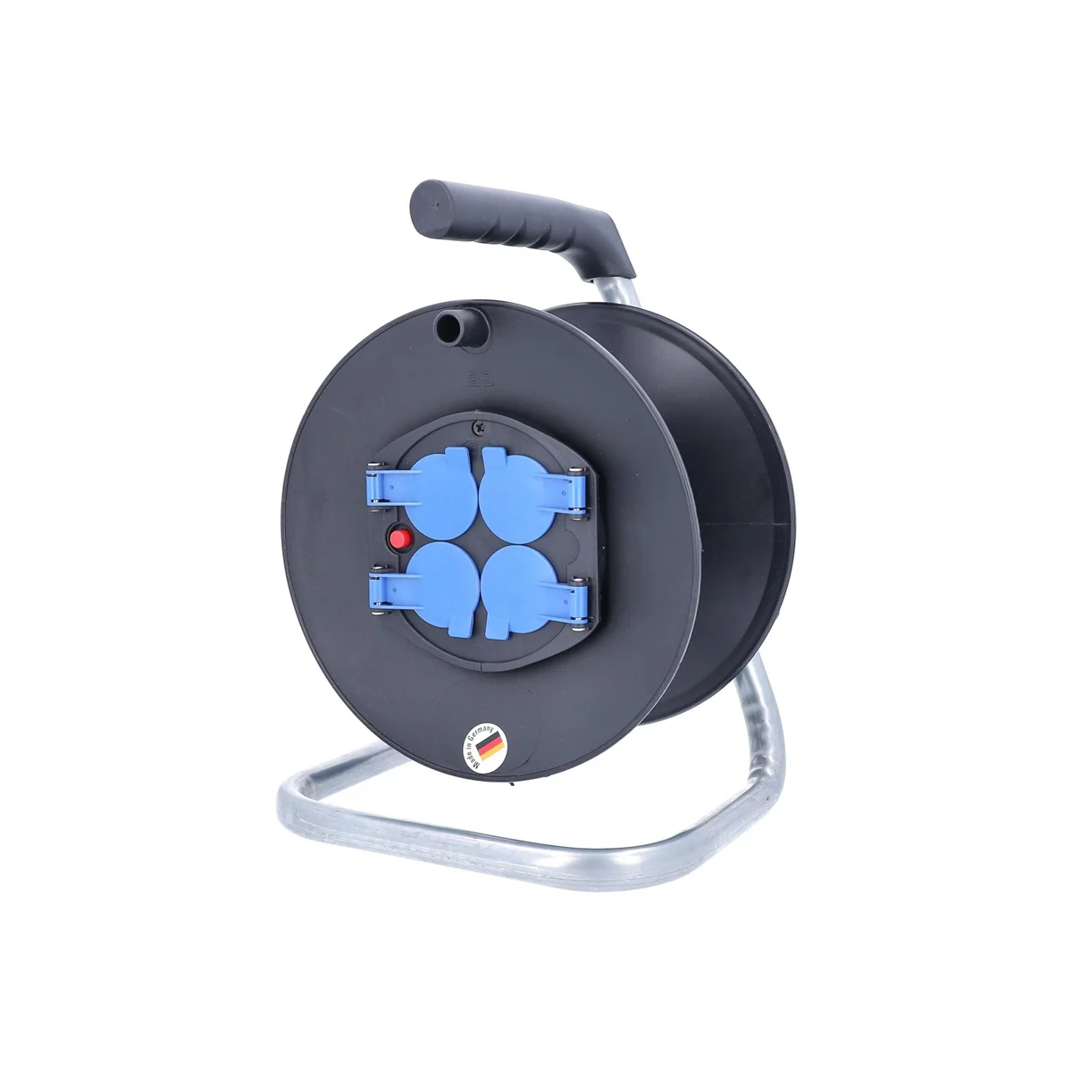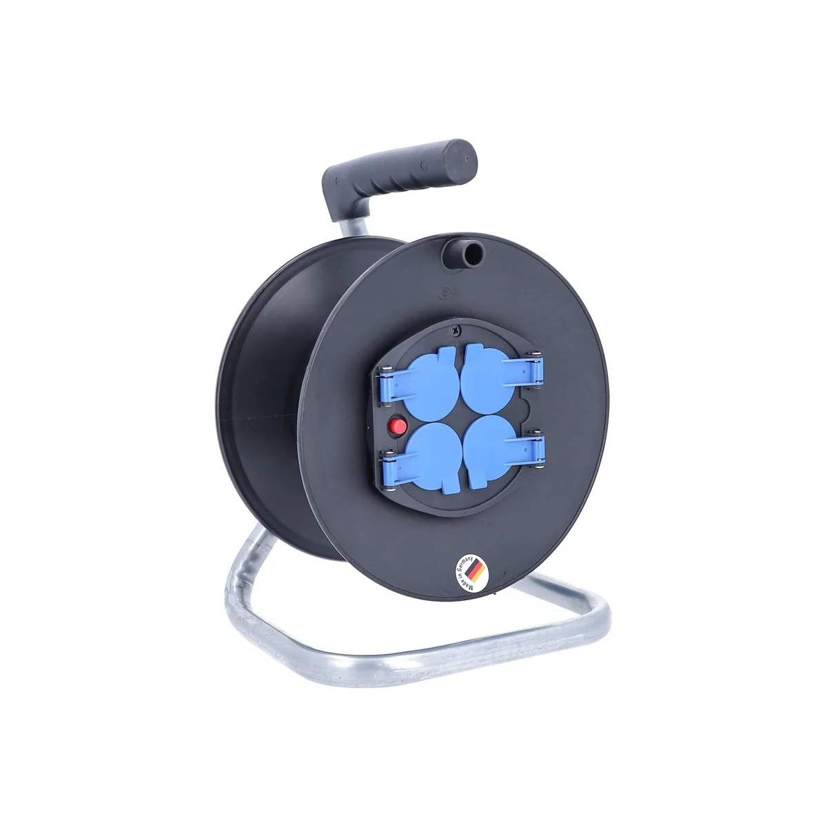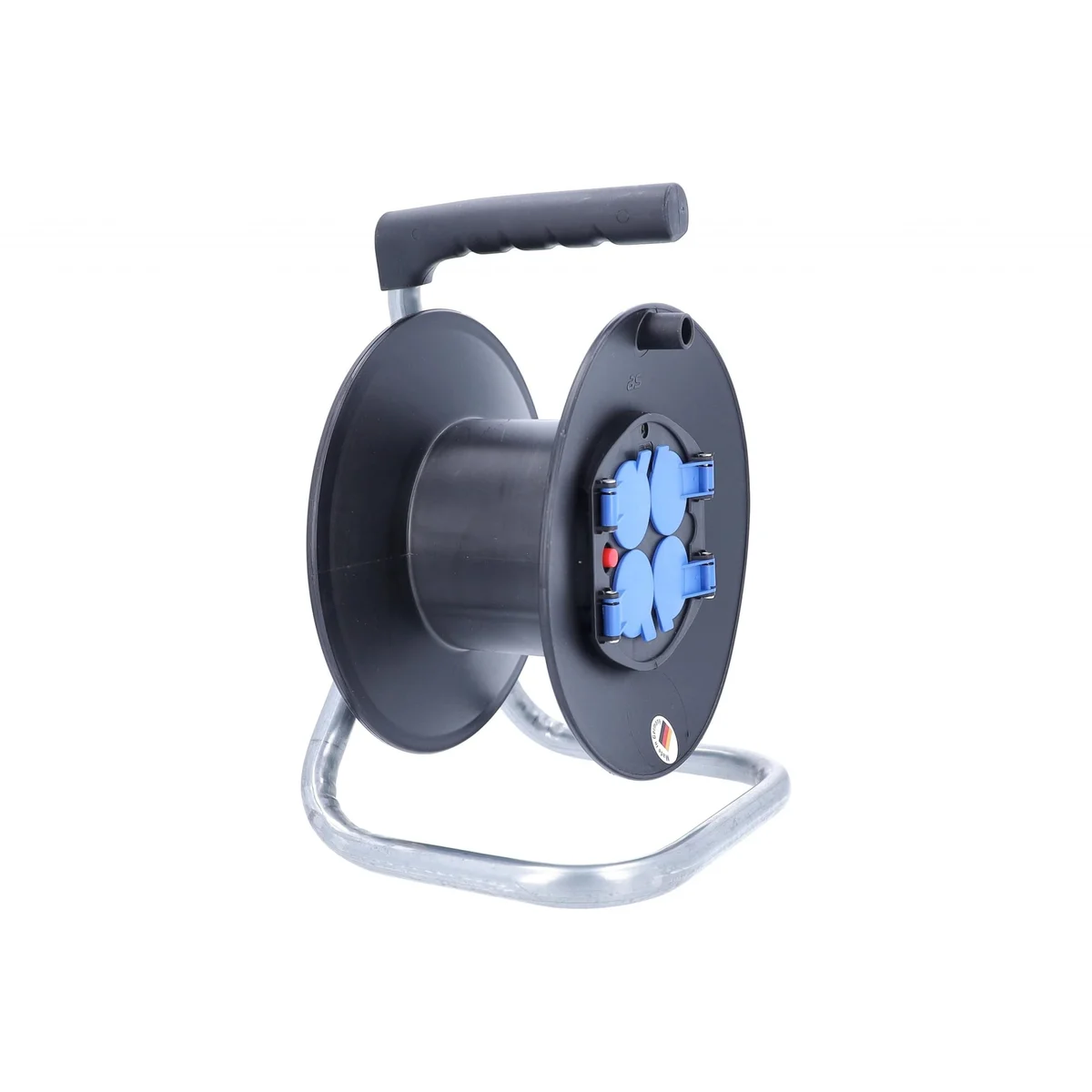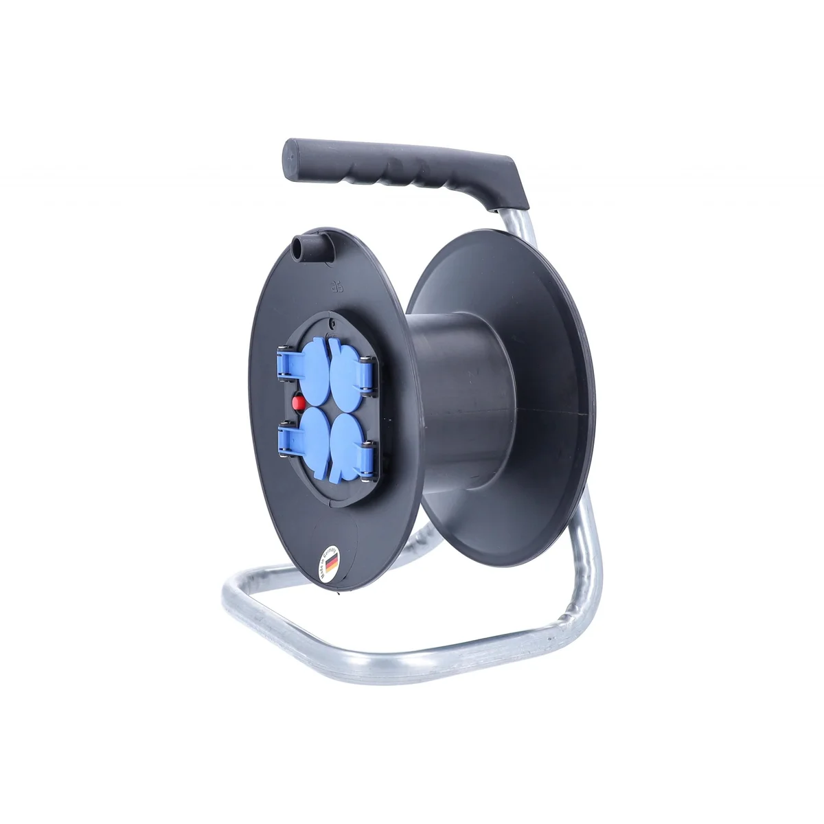 Pusty bęben plastikowy IP20 o średnicy 230 mm to idealne rozwiązanie dla profesjonalistów oraz użytkowników domowych, poszukujących funkcjonalności i wygody w zarządzaniu kablami. Wyposażony w metalowy stelaż oraz plastykową szpulę w eleganckim czarnym kolorze, bęben charakteryzuje się maksymalnym obciążeniem 230 V, 16 A oraz mocą 3500 W, co zapewnia wszechstronność jego zastosowania. Produkt oferuje cztery gniazda IP20 z niebieskimi klapkami, zapewniającymi dodatkowe uziemienie, co zwiększa bezpieczeństwo użytkowania. Dodatkowym atutem jest hamulec i uchwyt z tworzywa, które ułatwiają transport oraz zwijanie kabla. Dzięki klasie ochrony IP20, bęben jest przeznaczony do użytku wewnątrz pomieszczeń, co czyni go doskonałym wyborem dla warsztatów, biur oraz domów.