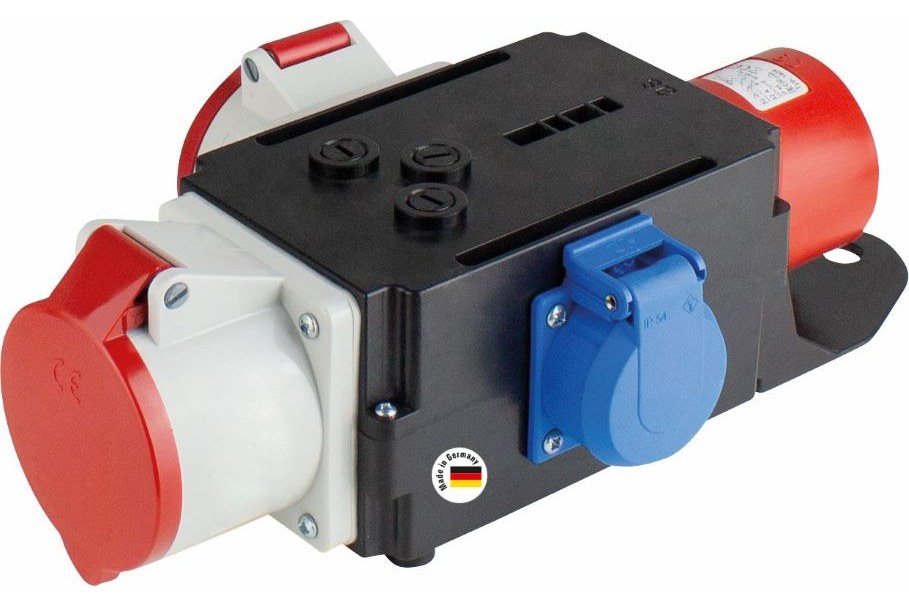 Wyjście | 1x gniazdo IP44 z klapką i uziemieniem 230 V, 16 A, 2P+Z 1x gniazdo CEE 400 V, 16 A, 5P 1x gniazdo CEE 400 V, 32 A, 5P |