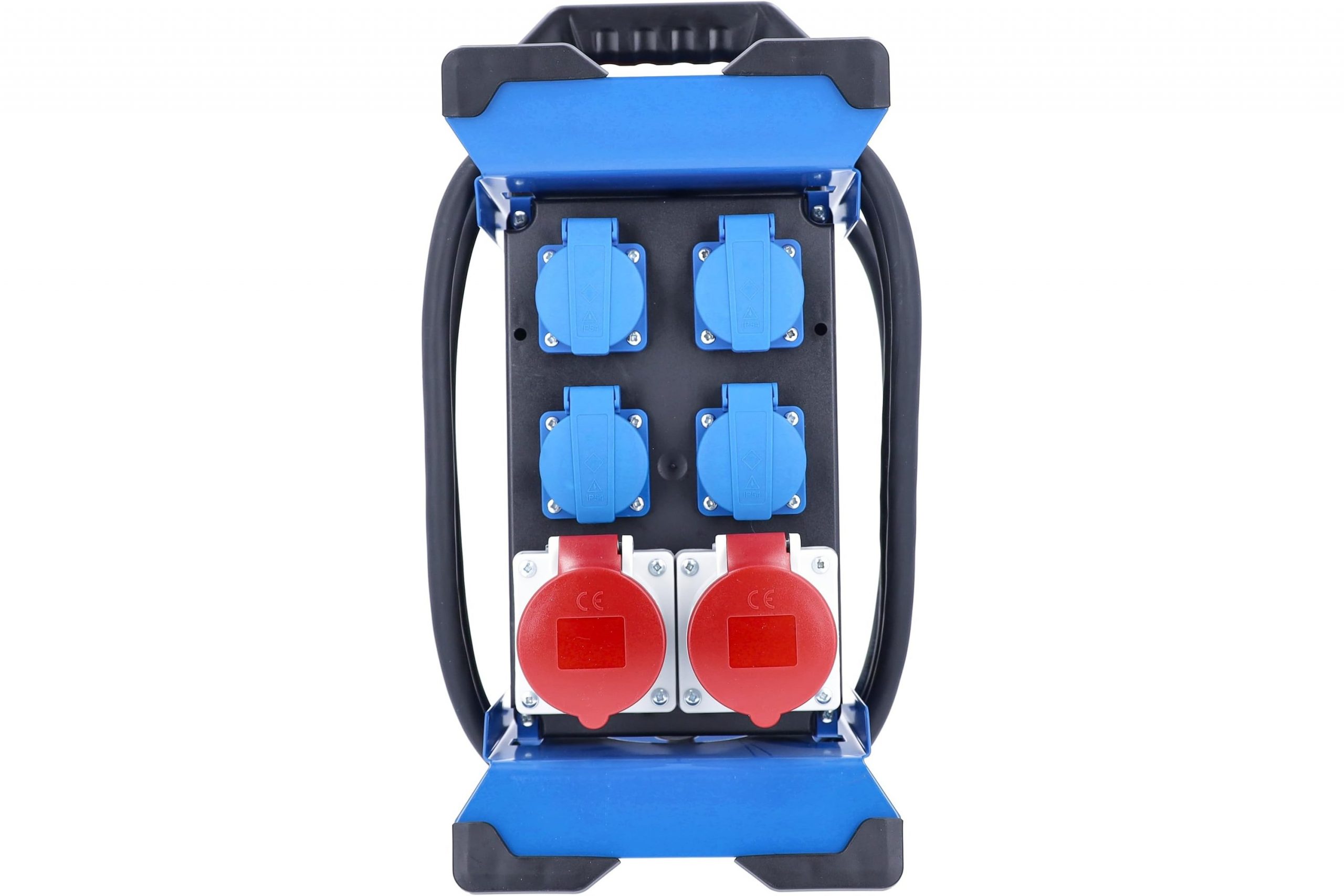 Wyjście | 4x gniazdo IP44 z klapką i uziemieniem 230 V, 16 A, 2P+Z (rozdzielone na 2 fazy) 2x gniazdo CEE 400 V, 16 A, 5P |
