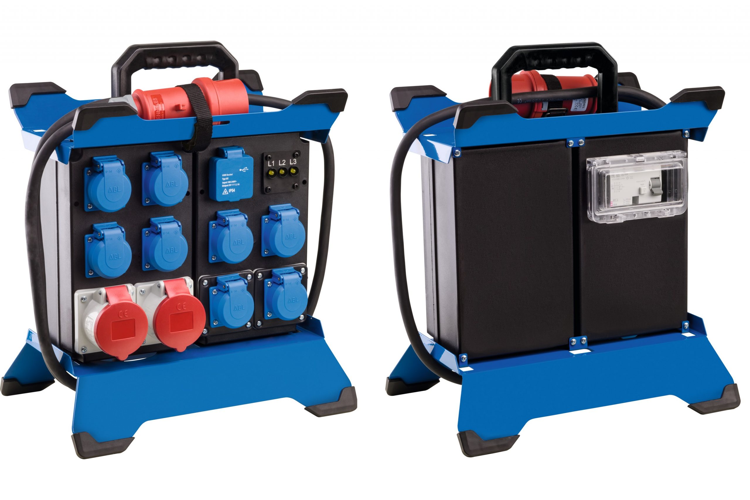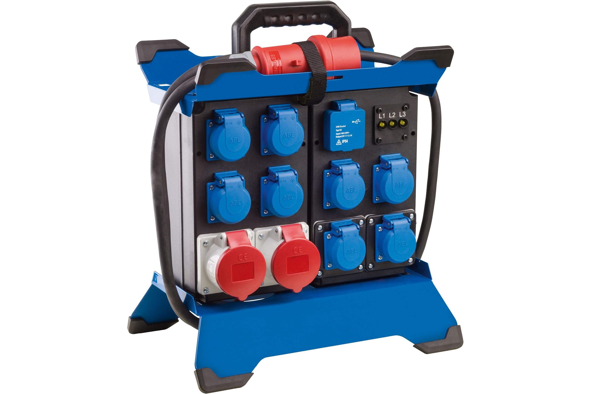 8x gniazdo IP44 z klapką i uziemieniem 230 V, 16 A, 2P+Z (rozdzielone na fazy) 2x gniazdo CEE 400 V, 16 A, 5P 2x port USB 5 V, 2, 1 A ze wskaźnikiem fazy L1, L2, L3