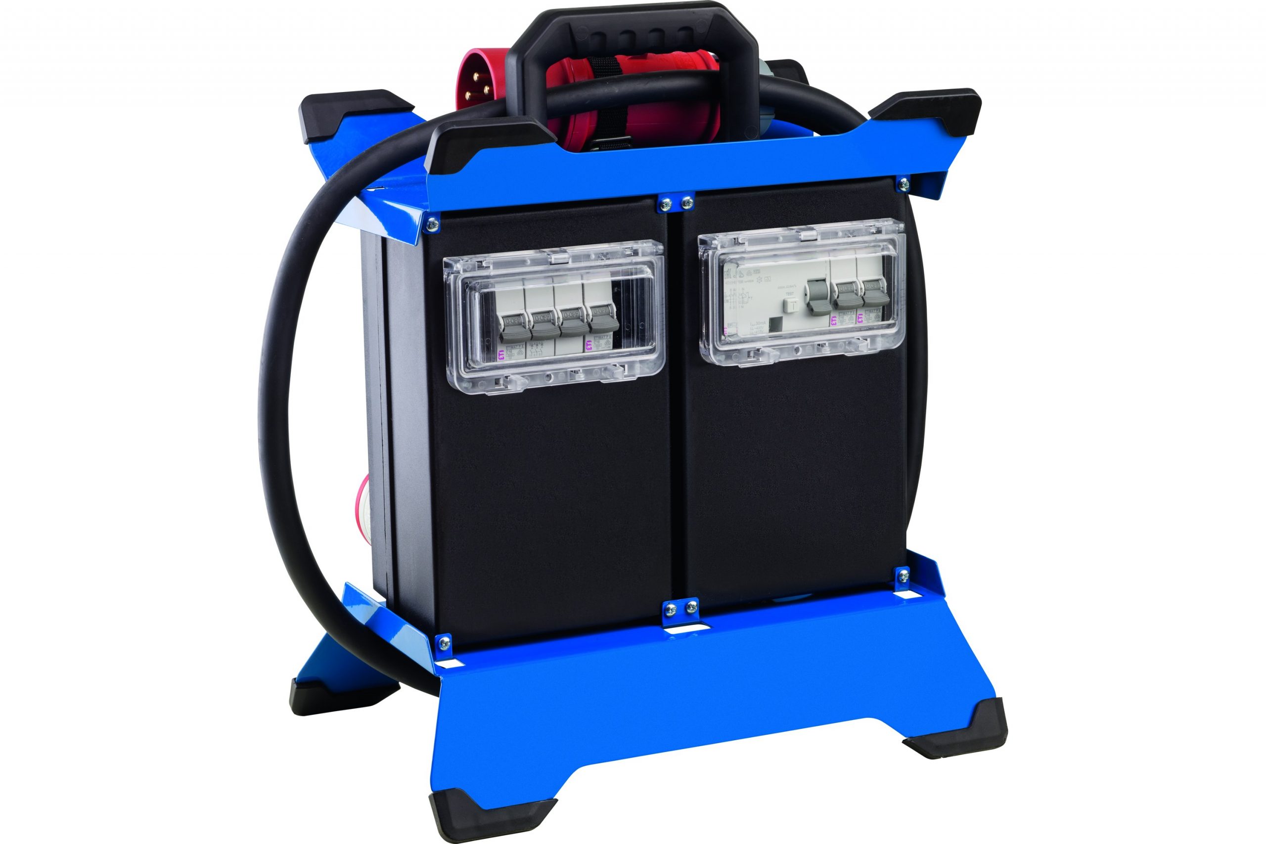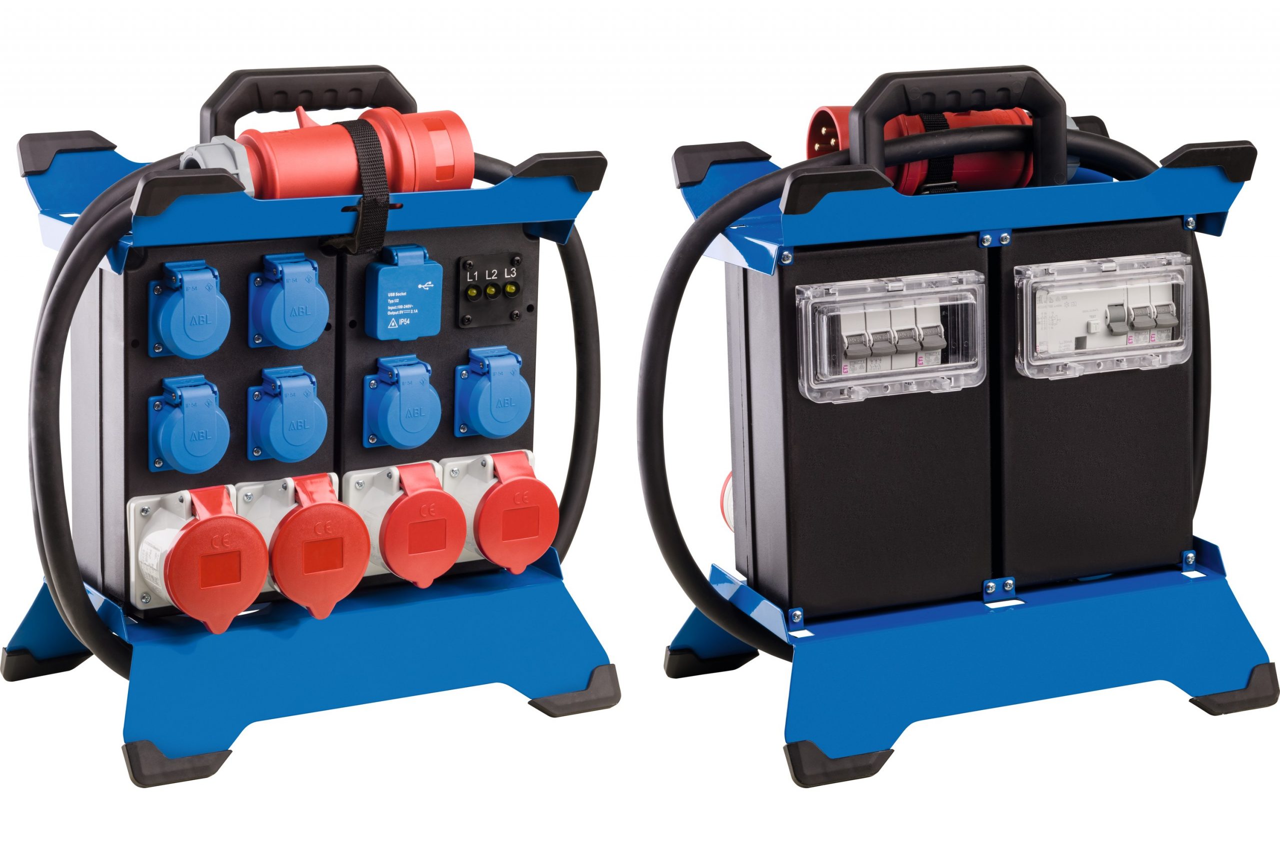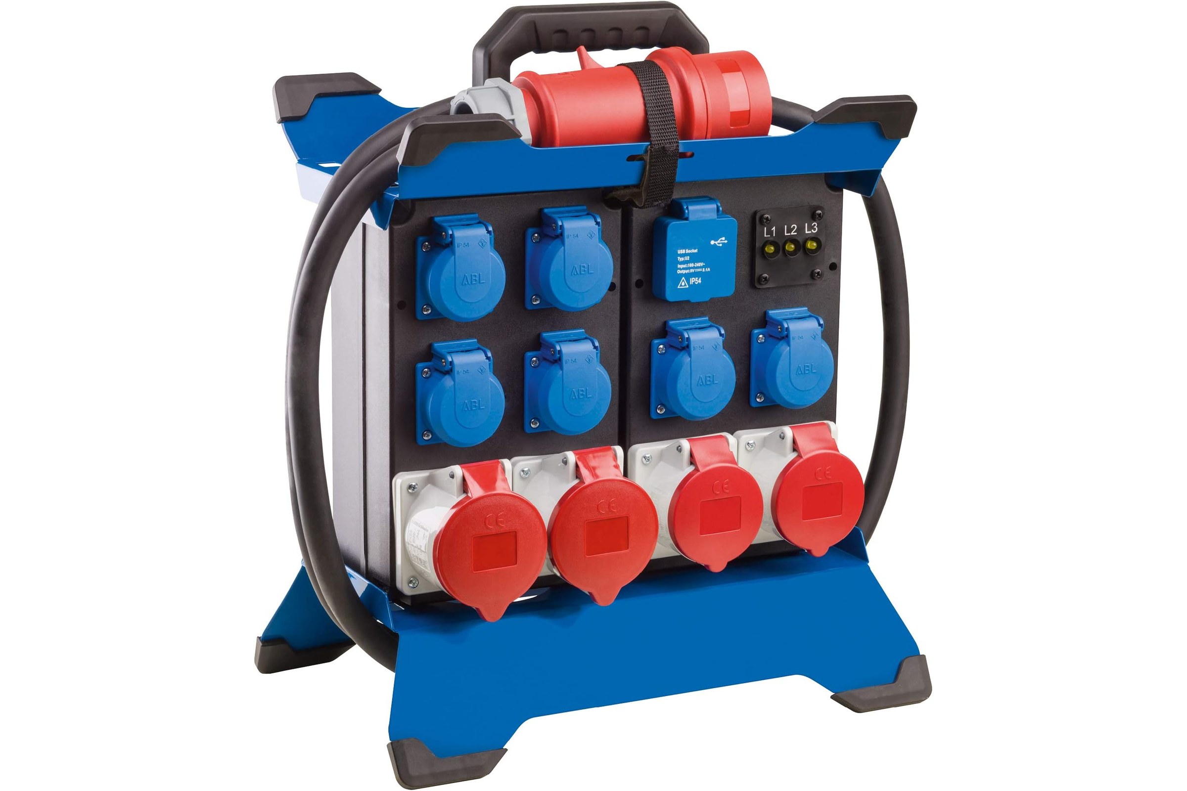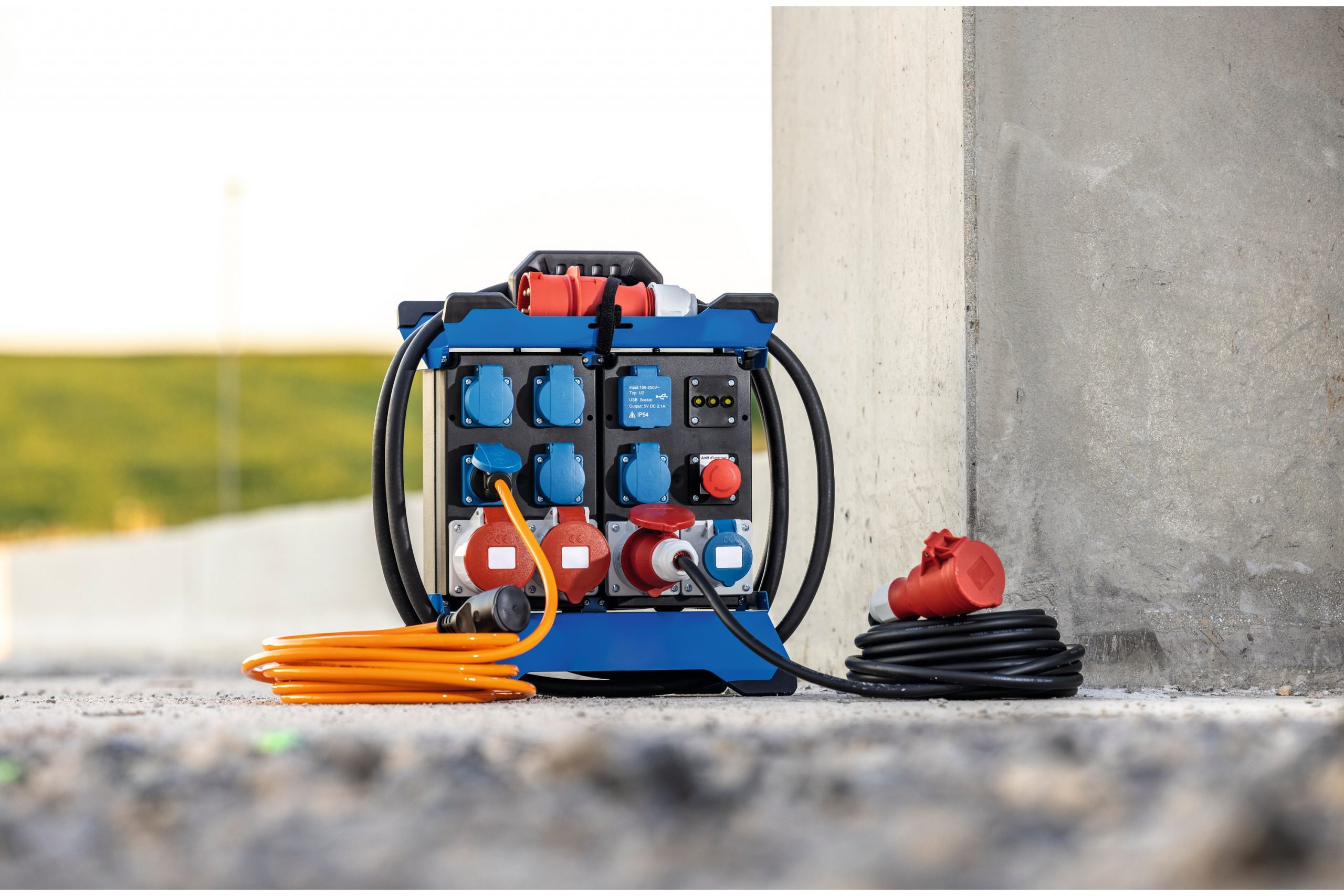 6x gniazdo IP44 z klapką i uziemieniem 230 V, 16 A, 2P+Z (rozdzielone na fazy) 2x gniazdo CEE 400 V, 16 A, 5P 2x gniazdo CEE 400 V, 32 A, 5P 2x port USB 5 V, 2, 1 A ze wskaźnikiem fazy L1, L2, L3