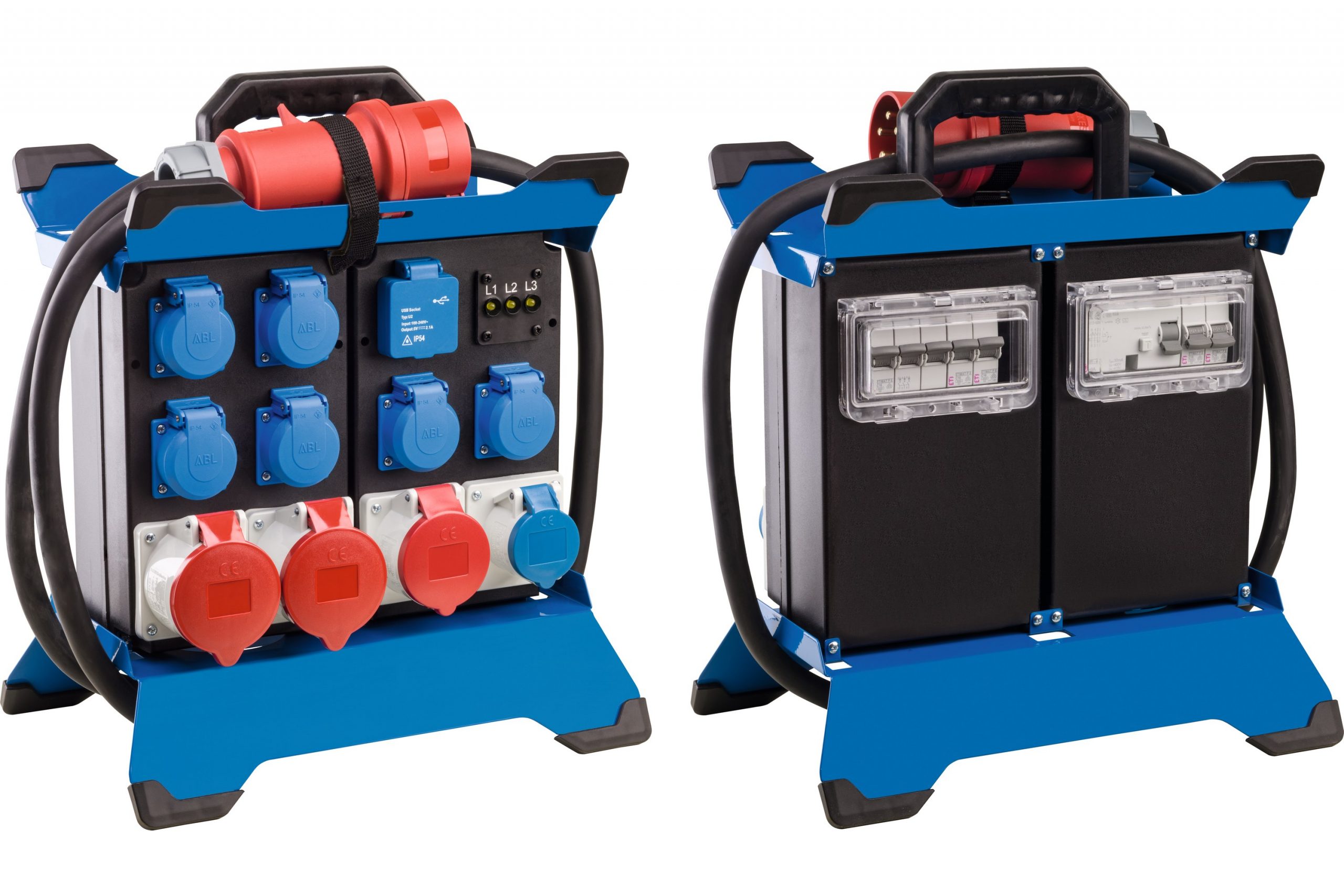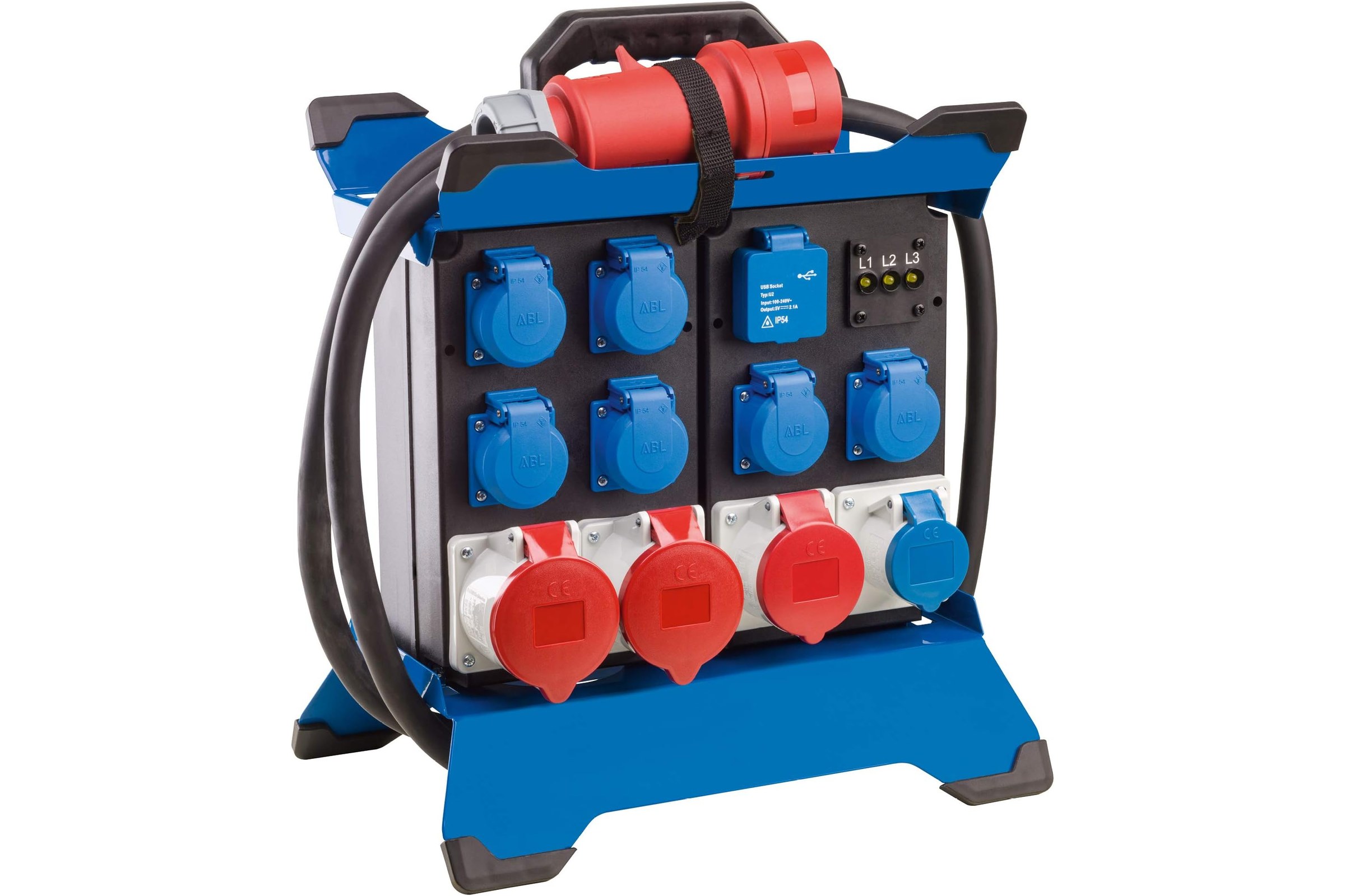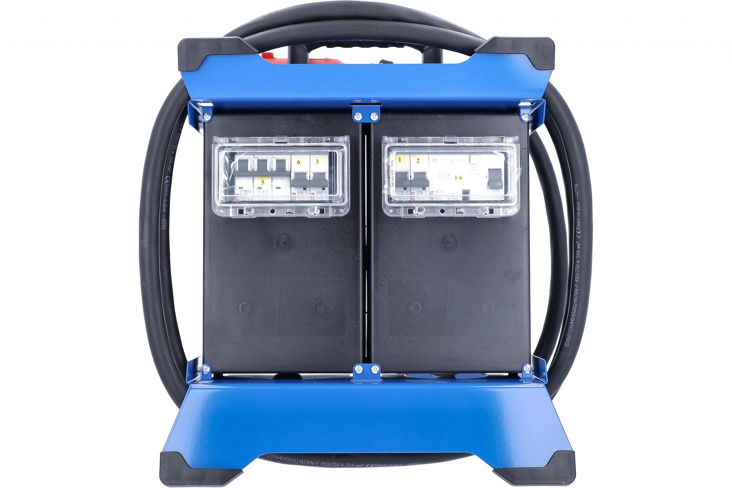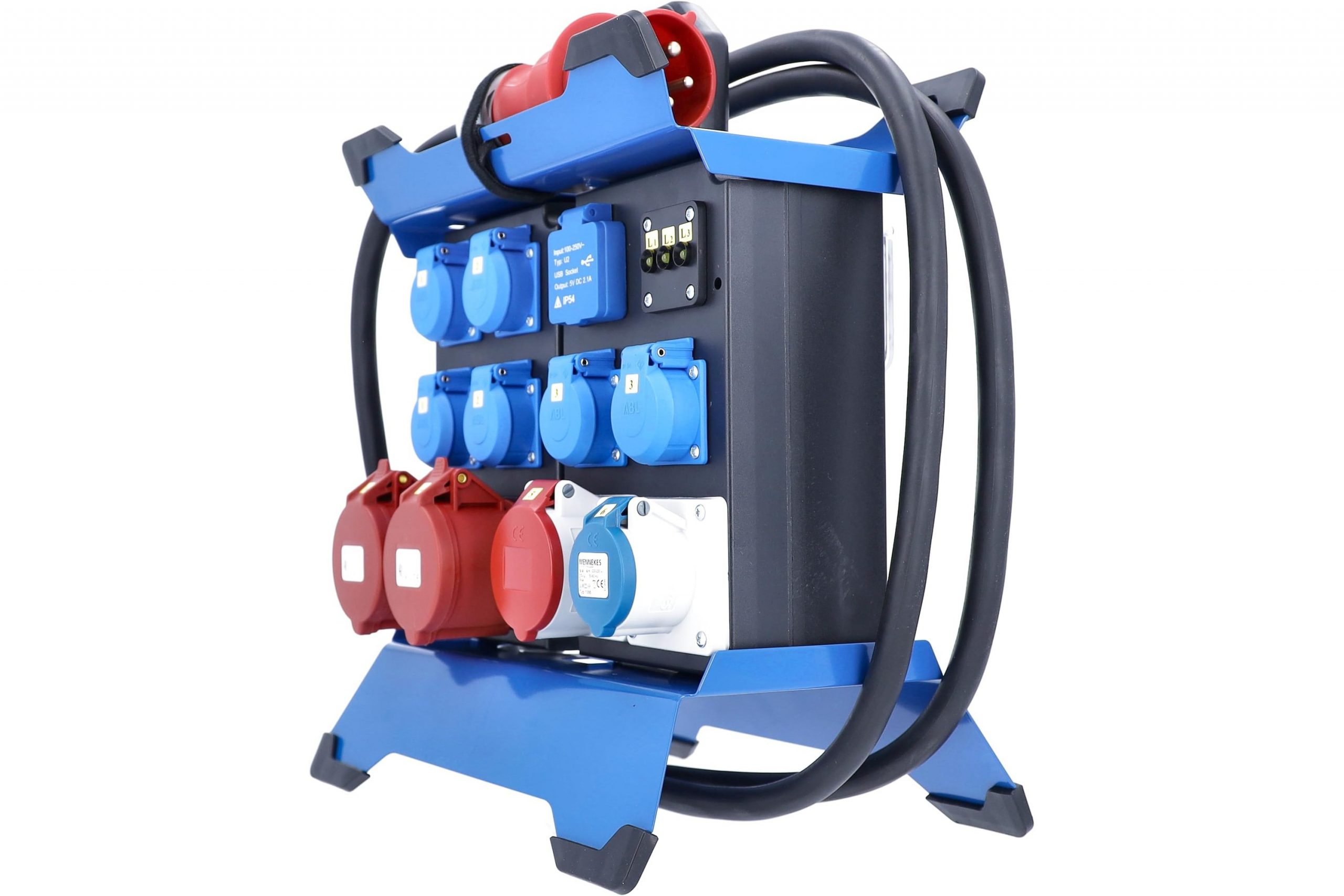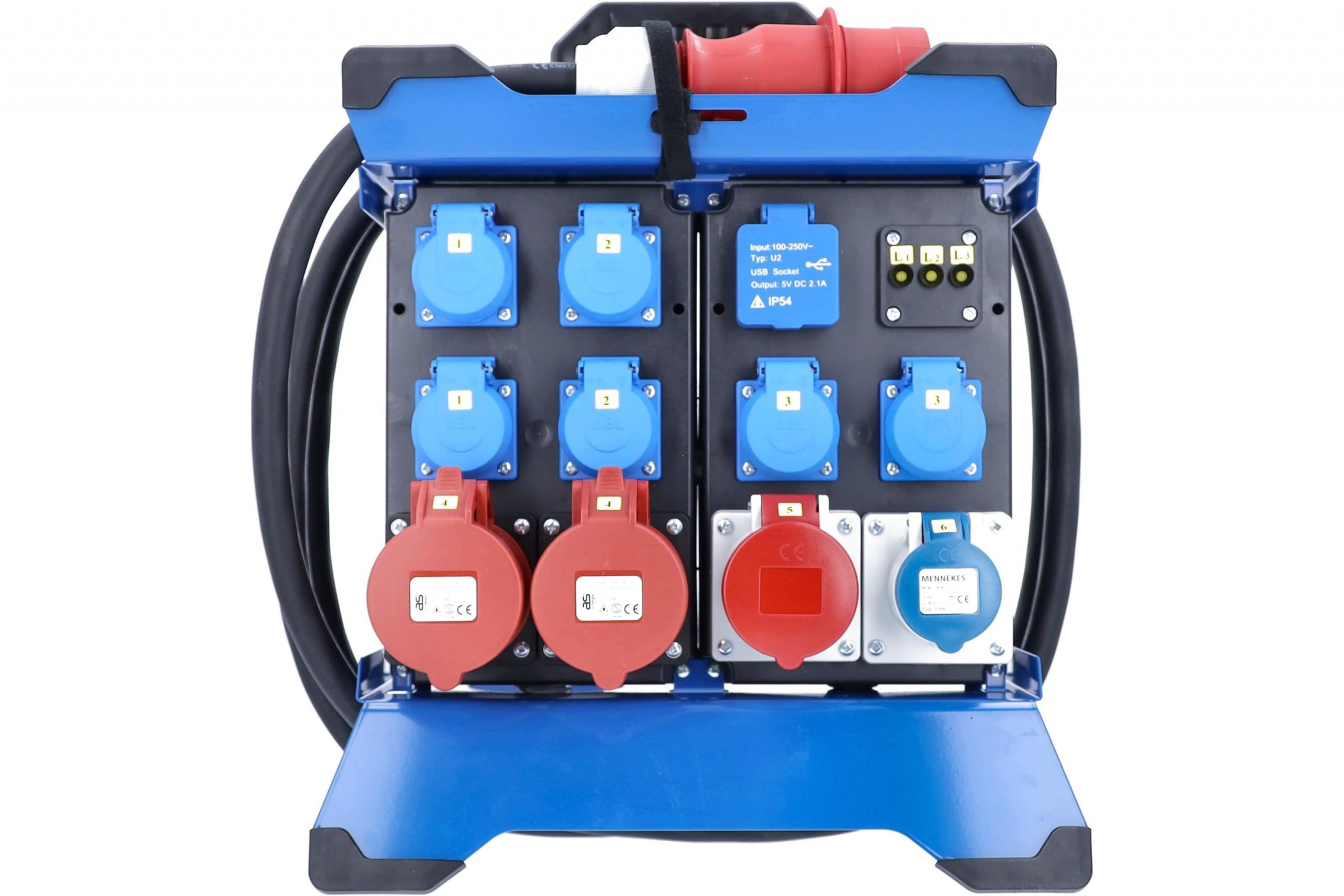 Wyjście | 6x gniazdo IP44 z klapką i uziemieniem 230 V, 16 A, 2P+Z (rozdzielone na fazy) 1x gniazdo CEE 230 V, 16 A, 3P 1x gniazdo CEE 400 V, 16 A, 5P 2x gniazdo CEE 400 V, 32 A, 5P 2x port USB 5 V, 2, 1 A ze wskaźnikiem fazy L1, L2, L3 |
