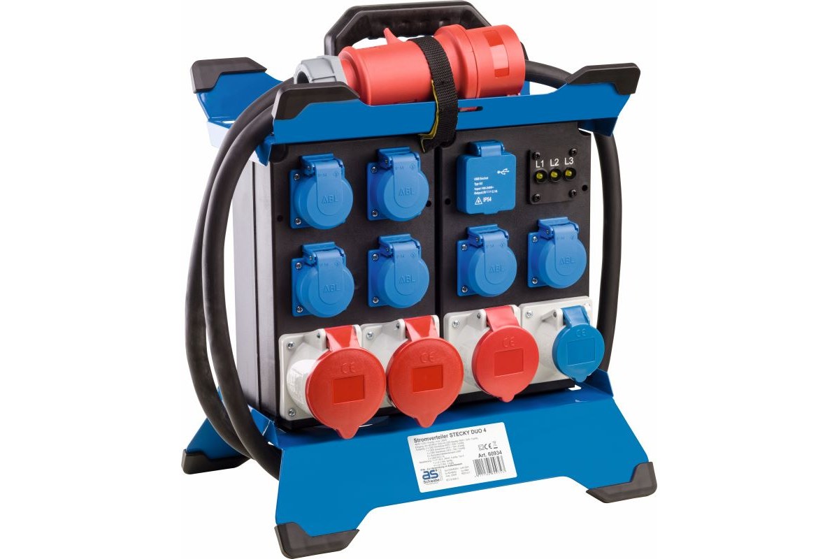Rozdzielnica przenośna STECKY DUO 4 „F“ to wszechstronne rozwiązanie do zasilania urządzeń w trudnych warunkach, idealna do użytku na placach budowy, imprezach plenerowych oraz w zastosowaniach przemysłowych. Wyposażona w przewód zasilający CEE 400 V, 32 A oraz 6 gniazd 230 V z uziemieniem, rozdzielnica umożliwia bezpieczne i efektywne podłączenie różnorodnych urządzeń. Dodatkowo, posiada gniazda CEE 400 V oraz USB, co czyni ją elastycznym narzędziem do zasilania sprzętu o różnym napięciu. Zintegrowany wskaźnik fazy oraz zabezpieczenia, w tym RCD 40 A i wyłączniki C, zapewniają wysoką ochronę przed przeciążeniem i zwarciem, co zwiększa bezpieczeństwo użytkowania. O klasie ochrony IP44 oraz maksymalnej mocy 22 kW rozdzielnicy można mówić jako o idealnych parametrach do intensywnego użytku w warunkach otwartych.