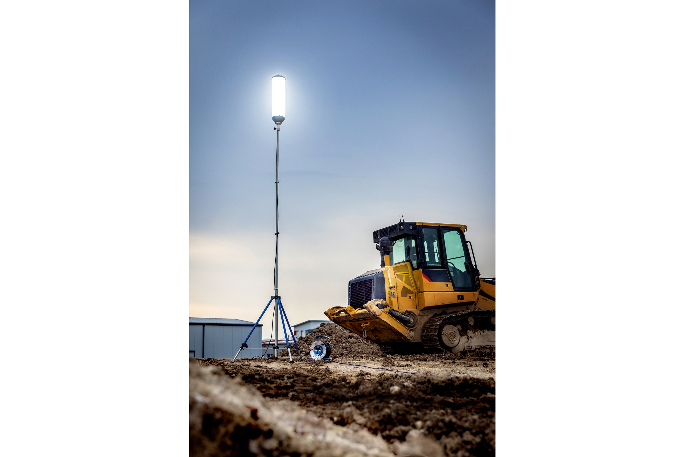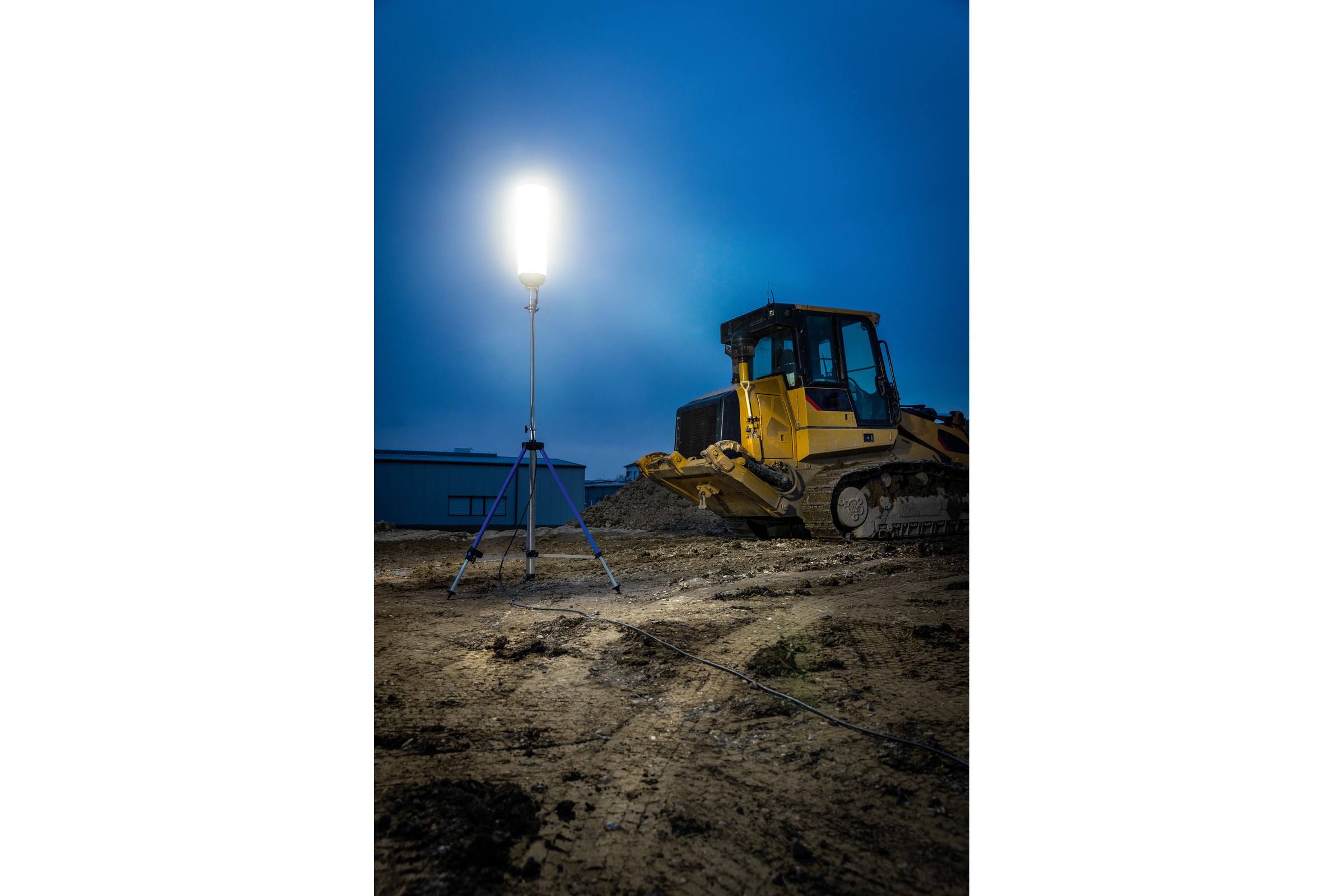 - statyw z czopem DIN i trawersem o długości 820 mm z mocowaniem DIN do szybkiego mocowania i zabezpieczania reflektorów roboczych na statywie