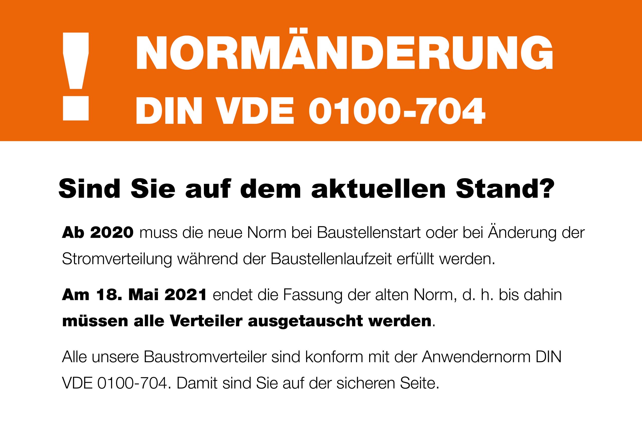 Ab 2020 muss die neue Norm bei Baustellenstart oder bei Änderung der Stromverteilung während der Baustellenlaufzeit erfüllt werden. Alle unsere Baustromverteiler sind konform mit der Anwendernorm DIN VDE 0100-704. Damit sind Sie auf der sicheren Seite.