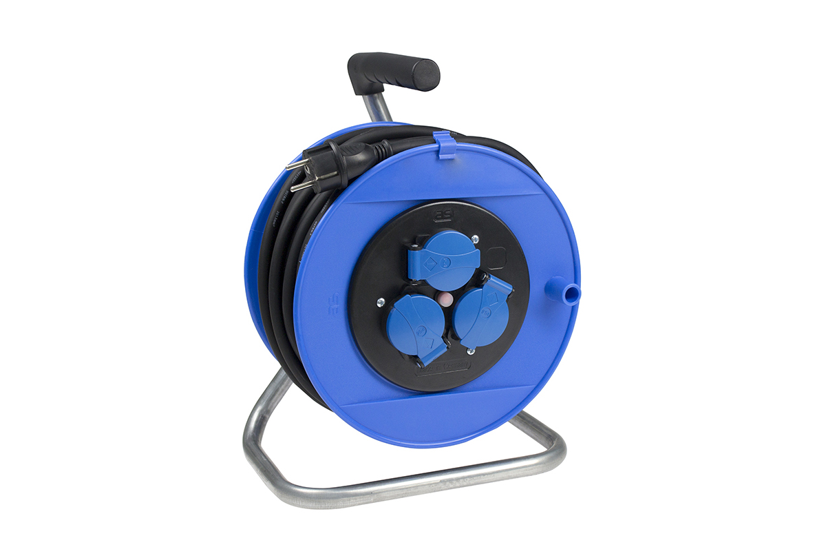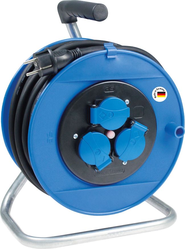 Kabeltrommel Blauer Trommelkörper (RAL 5017) 40 m schwere Gummischlauchleitung H07RN-F 3G1,5 mit Schutzkontaktstecker 3 Einbausteckdosen 230V / 16A mit Klappdeckel abgesichert durch Thermoschutzschalter verzinktes Fußgestell mit geformtem Haltegriff und Feststellbremse 230V / 16A / max. 3500W entspricht BGI608 (DGUV-I 203-006)/ K2 (BGI600)