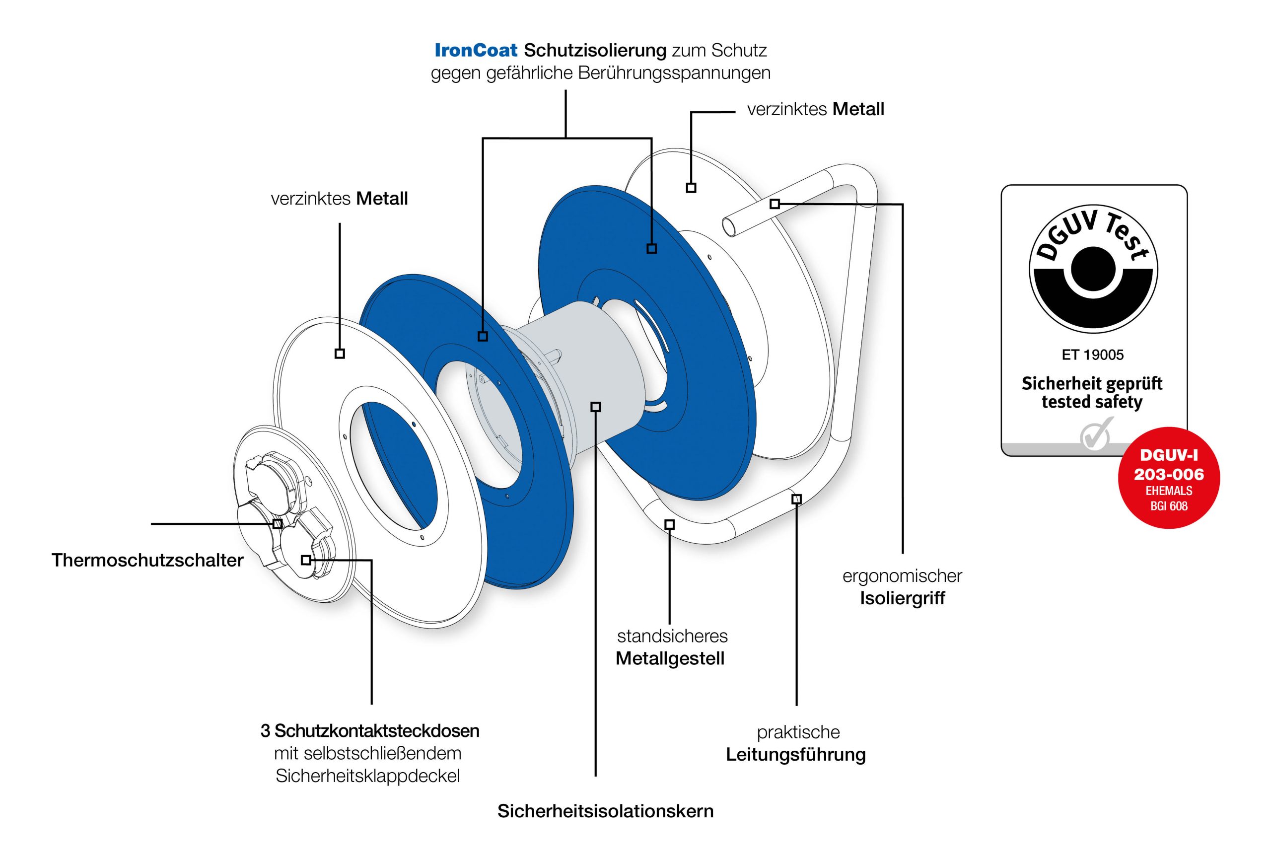 IronCoat Metallkabeltrommeln verbinden die Vorteile einer klassischen Stahlblechkabeltrommel mit einem verbesserten Schutz gegen gefährliche Berührungsspannungen. Die spezielle patentierte Schutzisolierung der Seitenteile schützt vor Stromschlägen durch defekte Kabelstränge bei aufgerollter Leitung. Dadurch kann kein Strom von innen an großflächig berührbare Teile der Kabeltrommel abgegeben werden, was einen Schutz vor schweren Gesundheitsschäden gewährleistet.