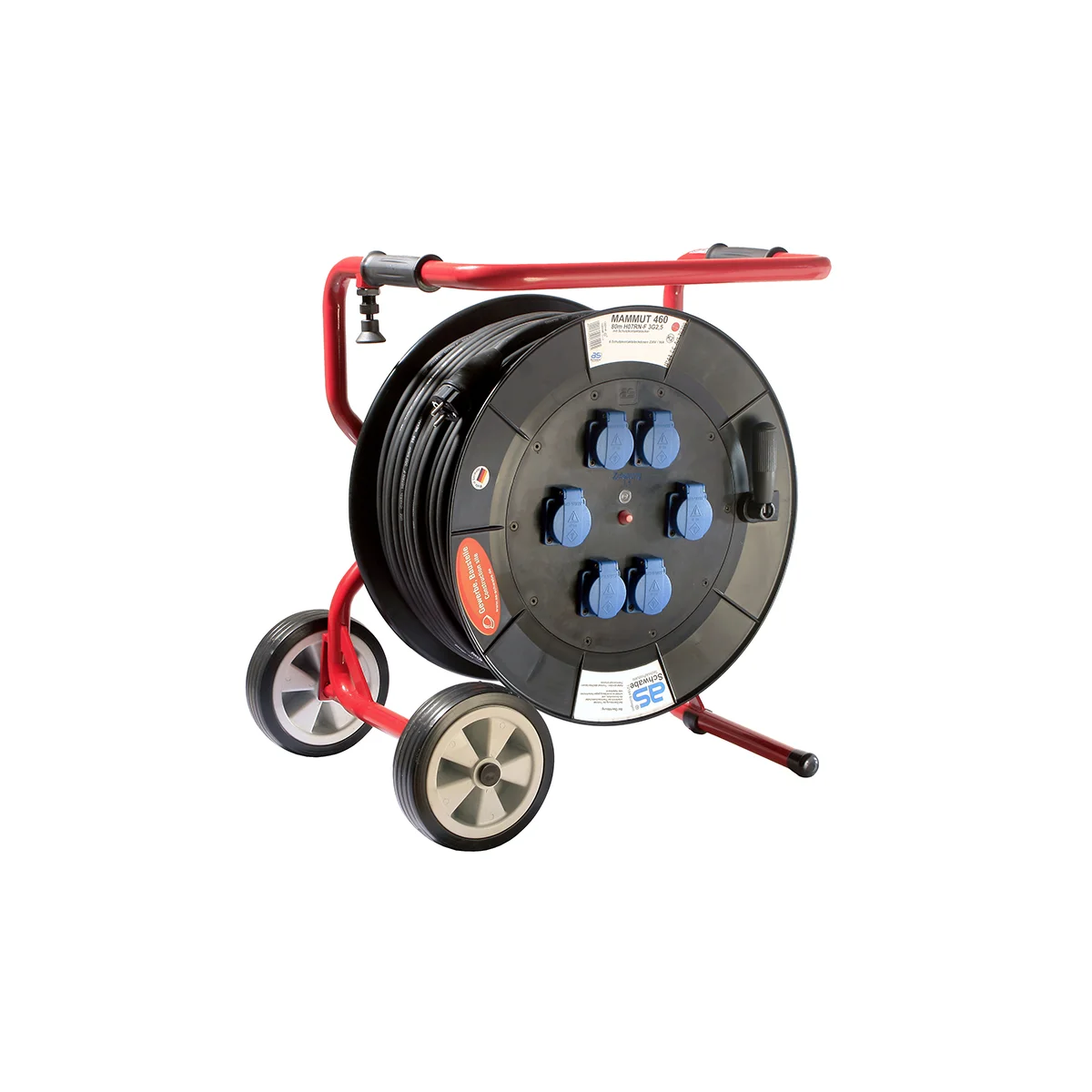 Die extra großen Mammut Kabeltrommeln sind der ideale Partner auf jeder Baustelle. Bestückt mit bis zu 80 Metern schwerer Gummischlauchleitung überwinden sie spielend große Distanzen.