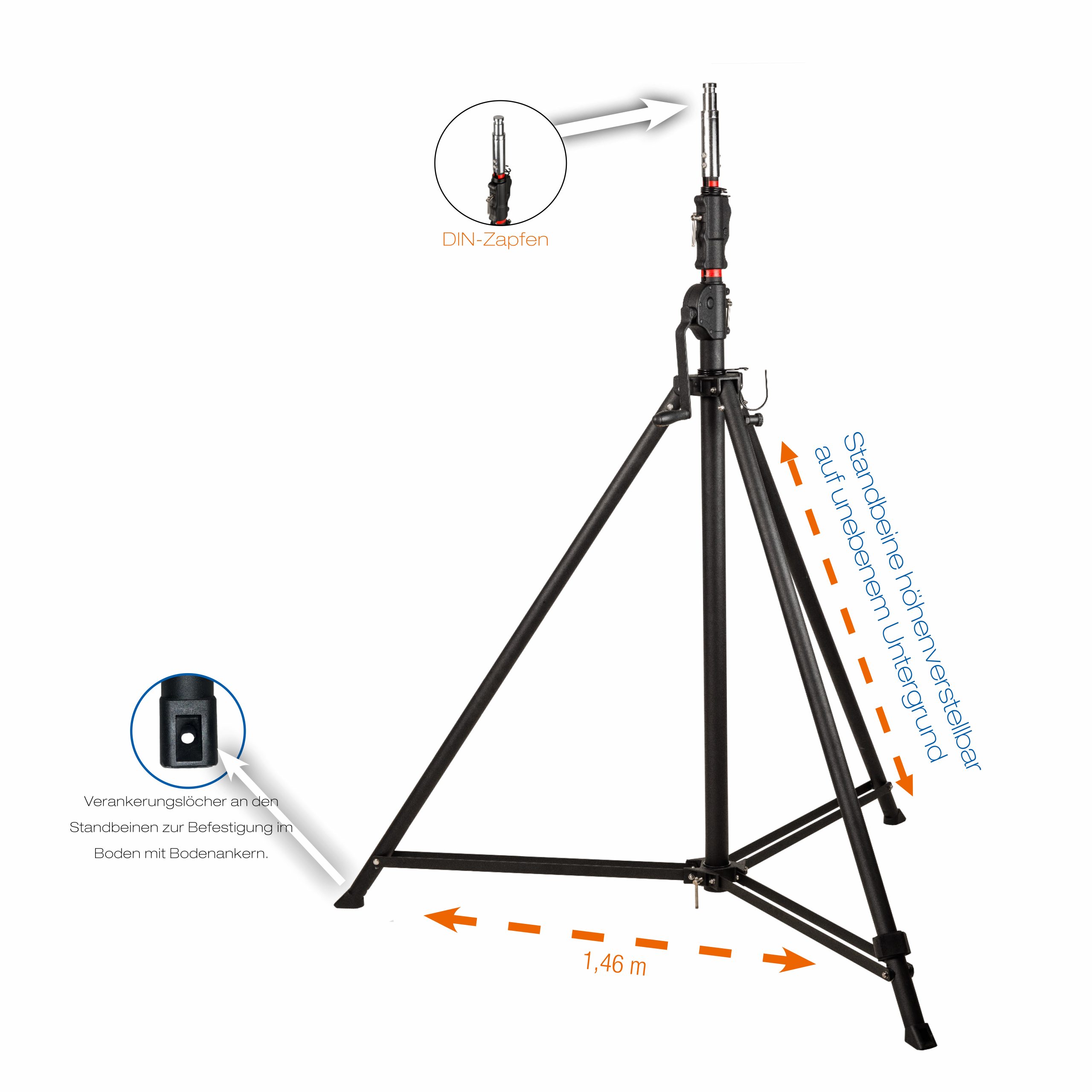• Stativ mit DIN-Zapfen und 820 mm langer Traverse mit DIN-Aufnahme zum schnellen Aufstecken und Sichern der Arbeitsleuchten auf dem Stativ
