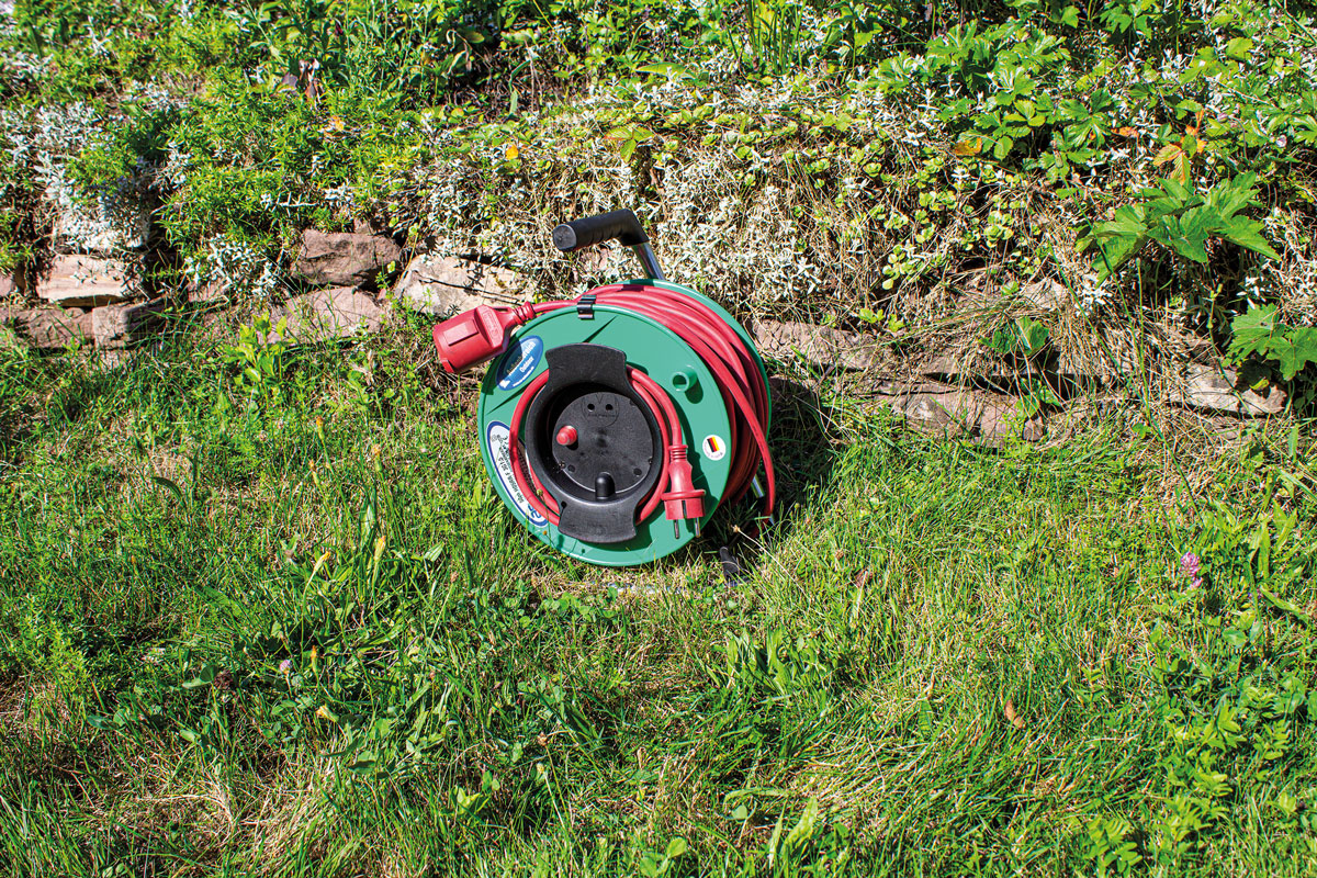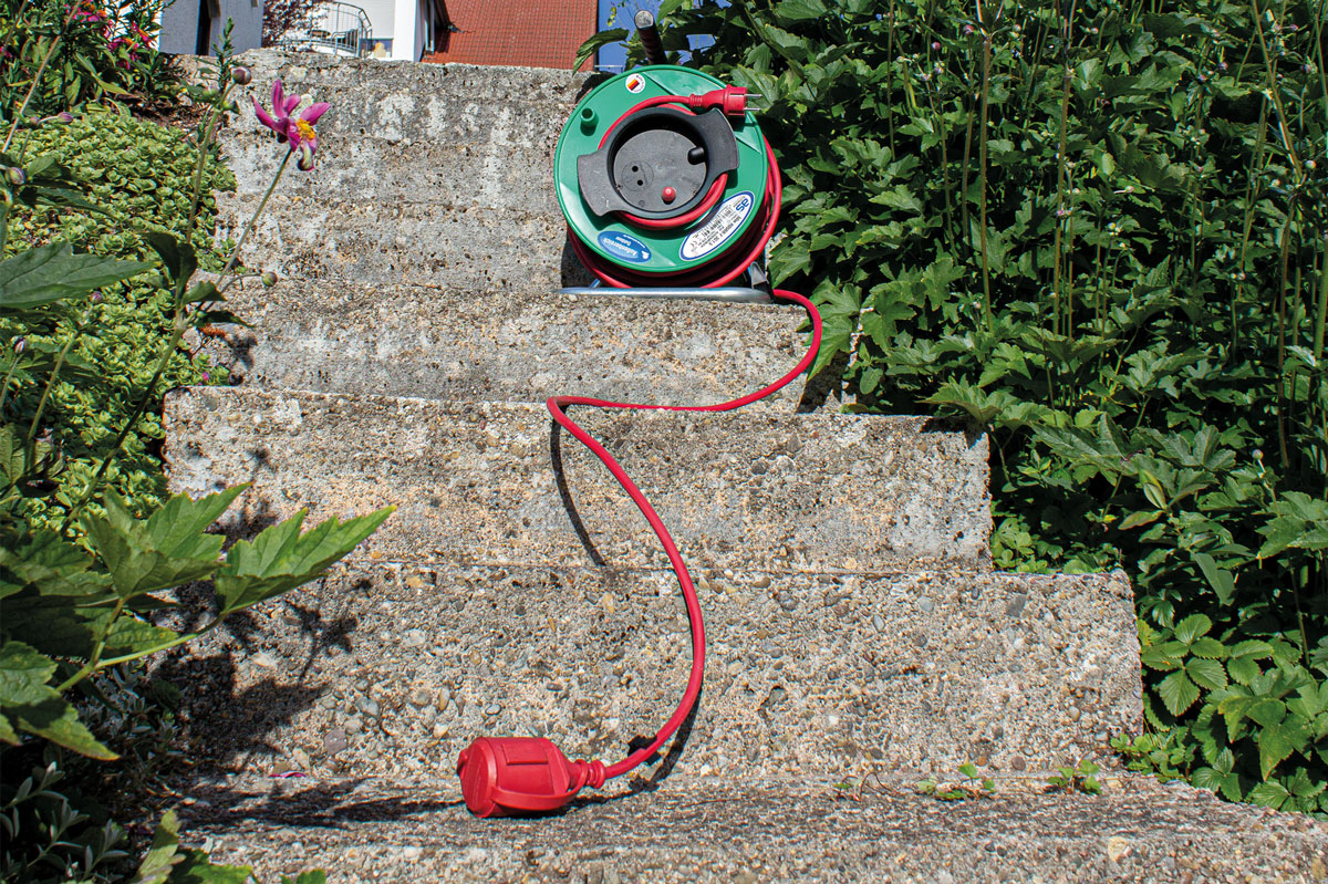 Gerätetrommeln ermöglichen das Arbeiten mit elektrischen Werkzeugen an Stellen, an denen Sie sich nicht ungehindert bewegen können, wie beispielsweise auf unebeen Untergrunden im Garten, am Hang oder über Treppen hinweg. Sie schließen die Gerätetrommel mit der 1,5 m langen Anschlussleitung an den Netzstrom an und lassen die Gerätetrommel auf dem stabilen Untergrund stehen. Rollen Sie anschließend die Verlängerungsleitung vom Trommelkörper ab und legen die Steckdose zum Arbeitsort. Dort schließen Sie Ihr Werkzeug bequem an und nutzen beim Arbeiten die volle Kabellänge ohne lästiges Umpositionieren der Kabeltrommel.
