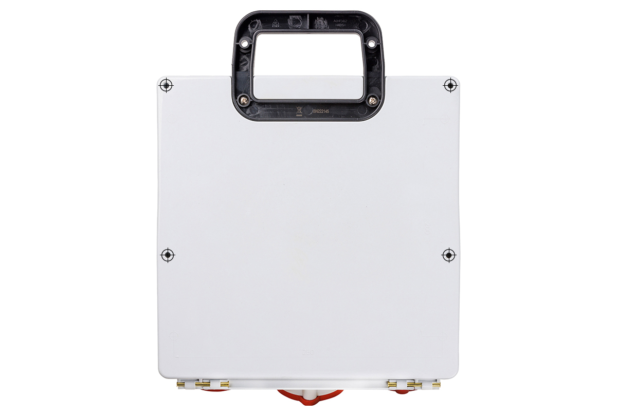 Für den dauerhaften Einsatz wird der Verteiler fest an der Wand montiert. Markierungen für Bohrlöcher auf der Rückseite des Gehäuses erleichtern die Montage. Bei zeitlich begrenzten Einsätzen kann der Verteiler alternativ auch mit Hilfe der Löcher im Griff an die Wand geschraubt werden.