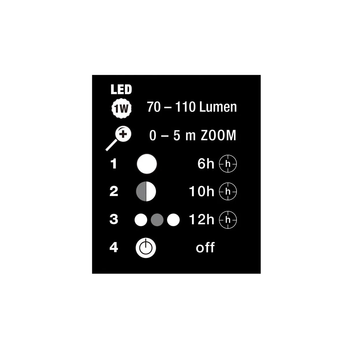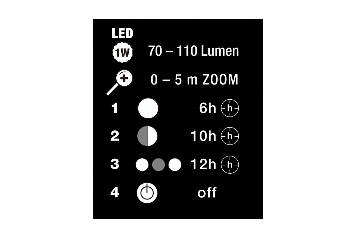 • Leuchtdauer bei halber Leistung: ca. 10 Stunden